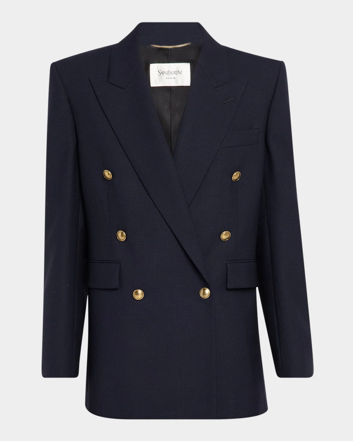 - Saint Laurent blazer jacket with six goldtone buttons - Peak lapels; double-breasted front - Long sleeves; button cuffs - Chest welt pocket - Hip flap pockets - Tailored fit - Double-vented back - Wool/silk/cotton - Made in Italy