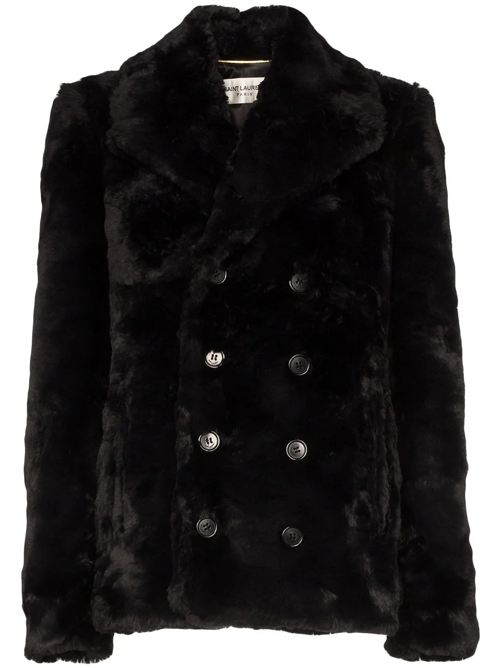 double-breasted short peacoat When all you need is a warm hug, forget people. This black peacoat will wrap you in a warm, loving hug, just like those Teddy Bear used to give you, growing up. Yes, Saint Laurent knows you miss your childhood and that's okay. Featuring an oversized collar, long sleeves, a double-breasted front fastening and side pockets. Made in Italy Composition Lining: Cupro 60%, Cotton 40% Outer: Polyester 100% SIZE & FIT Model measurements Height 5 ft 11 in(1.8 m) Bust/Chest 31.49 in(80 cm) Hips 35.43 in(90 cm) Waist 24.4 in(62 cm) Measurement BUST 43.3 in(110 cm) LENGTH 26.37 in(67 cm) Shoulder Width 16.53 in(42 cm) SLEEVE LENGTH 25.19 in(64 cm) WAIST 42.51 in(108 cm) Washing instructions Dry Clean Only