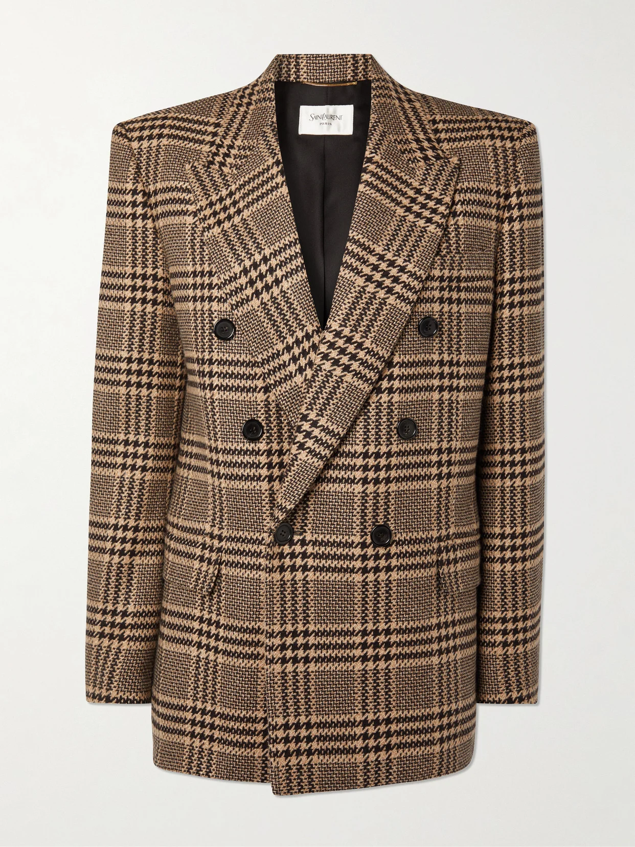 SAINT LAURENT's blazer pays homage to '80s power dressing. Tailored from a silk and cashmere-blend, it's patterned with classic houndstooth checks and has a double-breasted front with sharp padded shoulders.