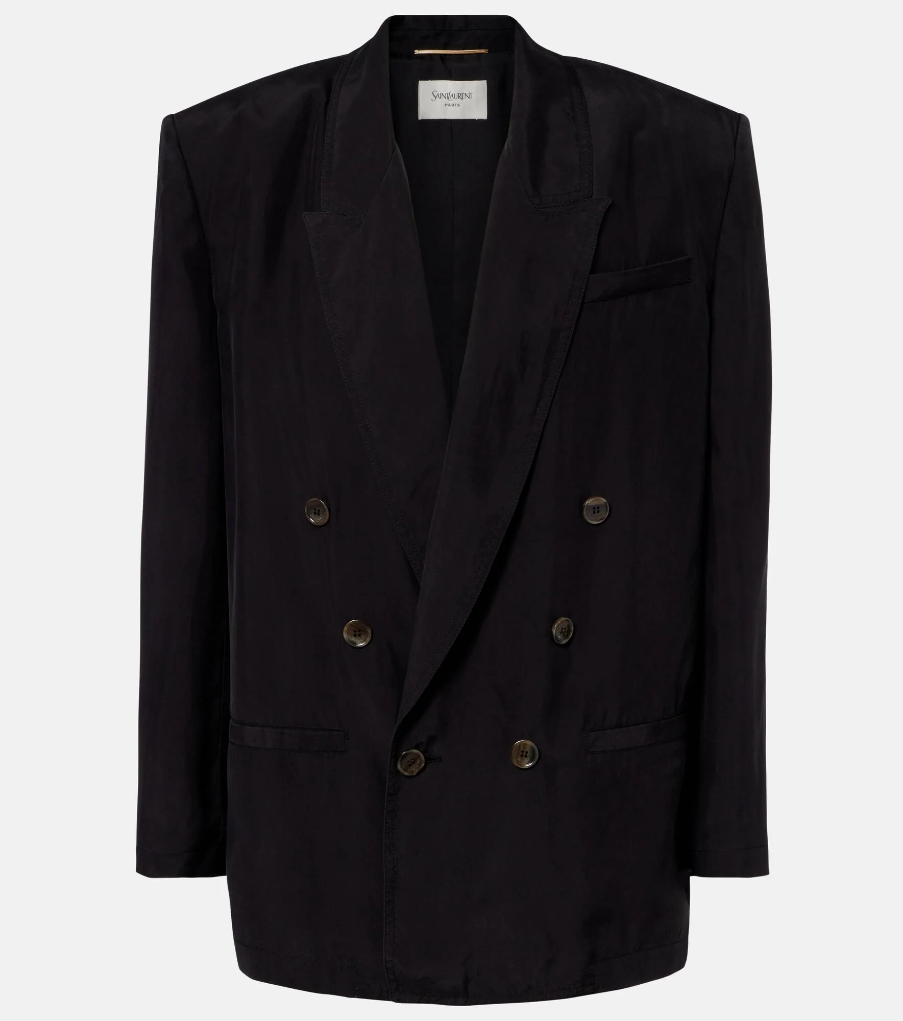 Tailoring has been synonymous with Saint Laurent since the "Le Smoking" suit was designed in the 1960s. This blazer is made from silk and features a double-breasted front. Product Details - Material: 100% silk - Care instructions: dry clean - Made in Italy - Color: brown - Designer color name: Noir - Lining: 100% silk - Contains non-textile parts of animal origin - Peak lapel - Shoulder pads - Closure: double-breasted (six buttons) - Pockets: breast pocket, welt pockets - Item number: P01156697 Size & Fit - True to size - Shoulder pad inserts - Designed for a loose fit - Non-stretchy fabric - Falls below the hip - The model seen in the picture is 178cm-5'10" and wearing a size FR 34