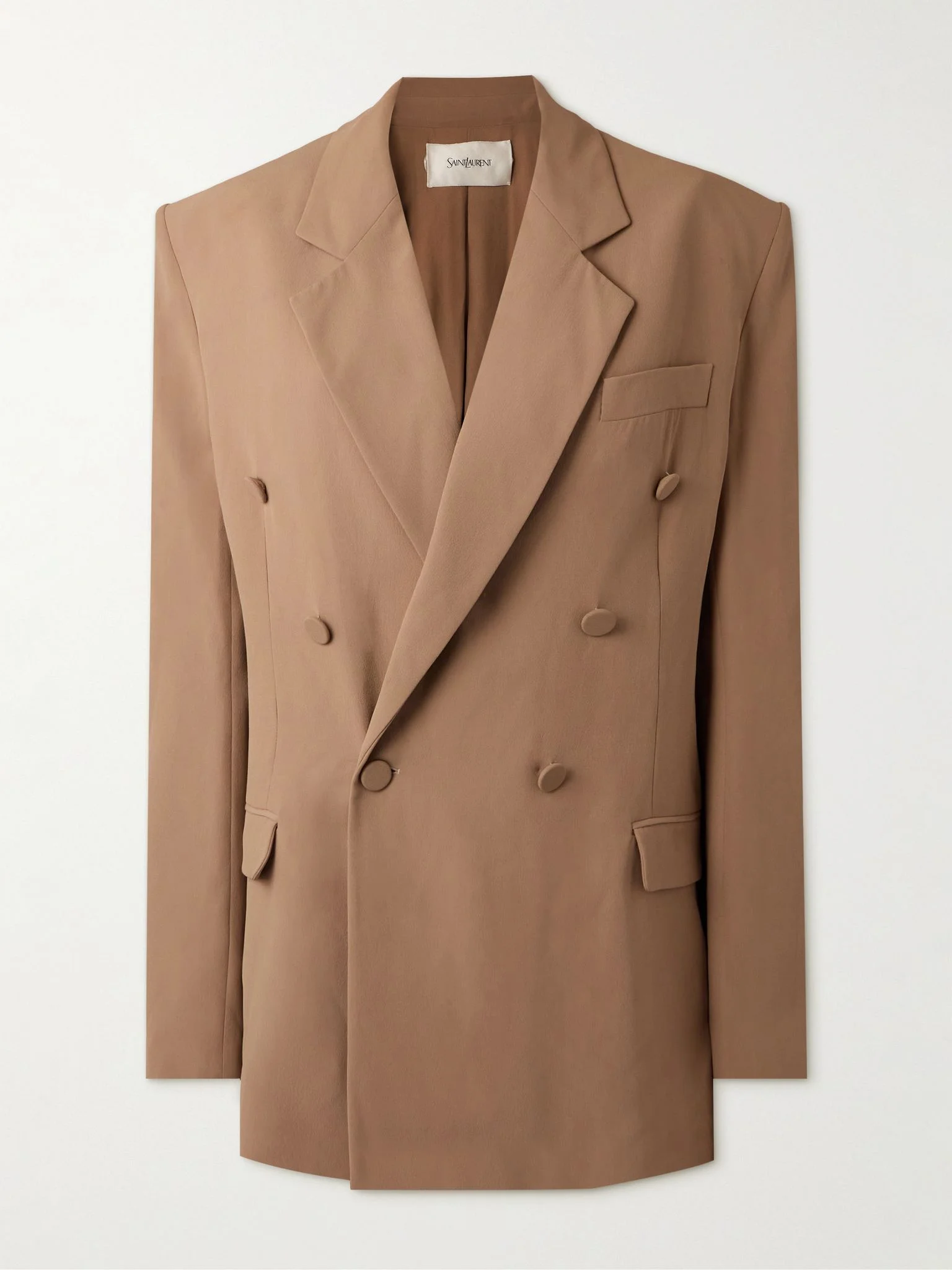 Brown is huge this season and SAINT LAURENT's blazer is such an easy way to tap into the trend. It's made from silk-crepe and has a double-breasted front with classic notch lapels. Size & Fit - Fits true to size, take your normal size - Tailored for a loose fit - Internal shoulder pads - Lightweight, non-stretchy fabric - Model is 180cm/ 5'11" and is wearing a FR 36 Model measurements: - Bust: 78cm/ 31" - Waist: 65cm/ 25.5" - Hip: 90cm/ 35.5" Details & Care - Light-brown silk-crepe - Button fastenings through double-breasted front - 100% silk - Dry clean
