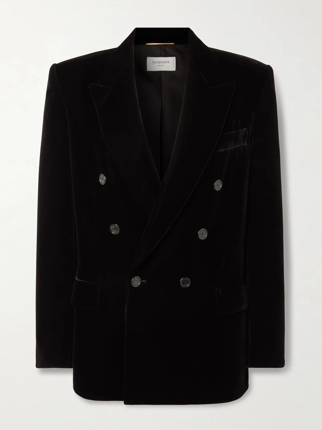 For decades, stylish women have turned to SAINT LAURENT's tailored jackets to elevate their outfits. This blazer is cut from plush velour in a sharp double-breasted silhouette enhanced by padded shoulders. It's fully lined with smooth silk, so it layers neatly over shirts or knitwear.