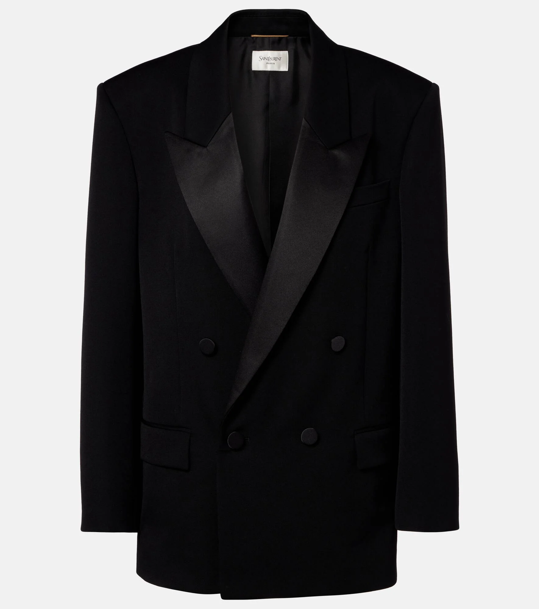 Since its conception in 1961, Saint Laurent has been coveted for its elegant Parisian aesthetic. This blazer is crafted in Italy from pure wool and tailored to a double-breasted silhouette with padded shoulders. Product Details - Material: 100% wool - Care instructions: dry clean - Made in Italy - Color: black - Designer color name: Noir - Item color: black - Details: 100% polyester - Lining: 100% silk - Contains non-textile parts of animal origin - Peak lapel - Closure: double-breasted (four buttons) - Pockets: flap pockets - Shoulder pads - Cuff: four buttons - Vent: double - Item number: P01128154 Size & Fit - True to size - Shoulder pad inserts - Straight fit - Non-stretchy fabric - Falls below the hip - The model seen in the picture is 178cm-5'10" and wearing a size FR 34