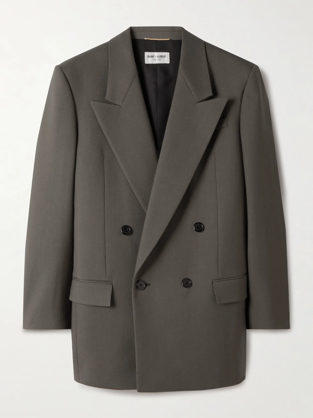 SAINT LAURENT is known for its impeccable tailoring. This double-breasted blazer is made from wool-gabardine and has a relaxed fit enhanced by dropped shoulders and large peak lapels.
