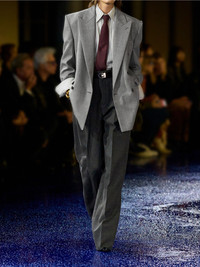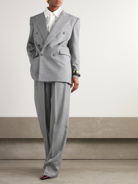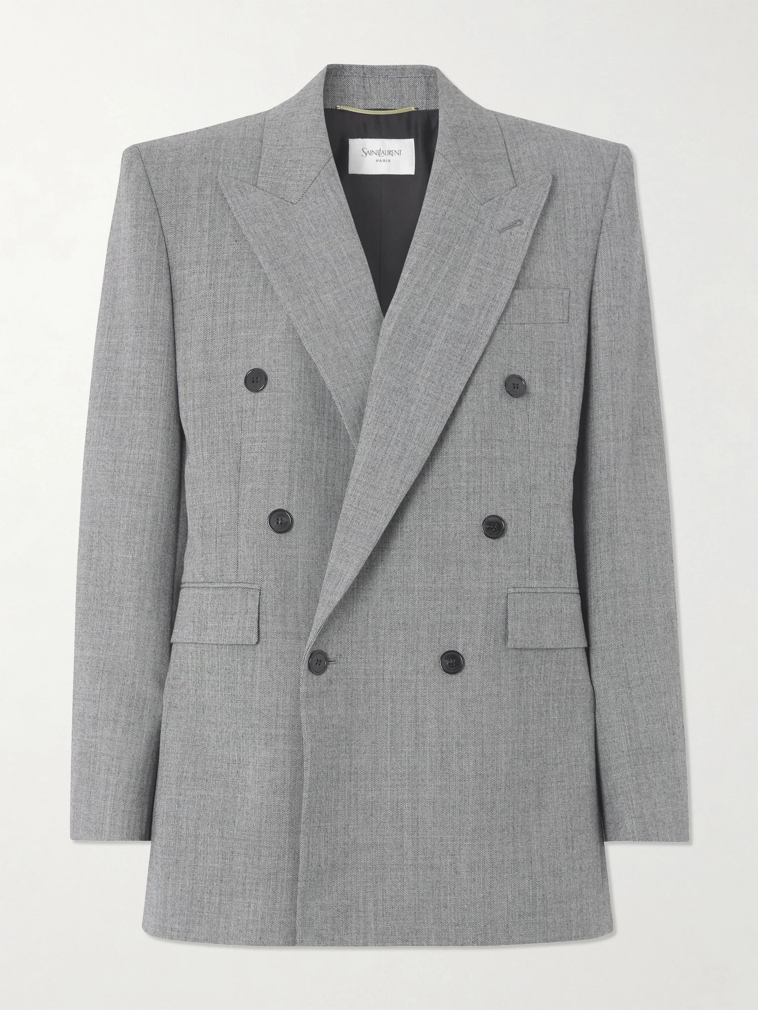 SAINT LAURENT's blazer takes cues from '80s power suits. Tailored from melange wool-twill, it's cut with a double-breasted closure, structured shoulders and wide peak lapels. Look to the Spring '25 runway and style yours with wide pants and a tie. Size & Fit - Fits true to size, take your normal size - Tailored for a slightly loose fit - Internal shoulder pads - Mid-weight, non-stretchy fabric - Model is 180cm/ 5'11" and is wearing a FR 36 Model measurements: - Bust: 75cm/ 29.5" - Waist: 60.5cm/ 24" - Hip: 88.5cm/ 35" Details & Care - Gray wool-twill - Button fastenings through double-breasted front - 100% wool - Dry clean