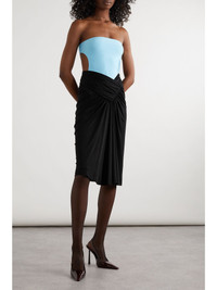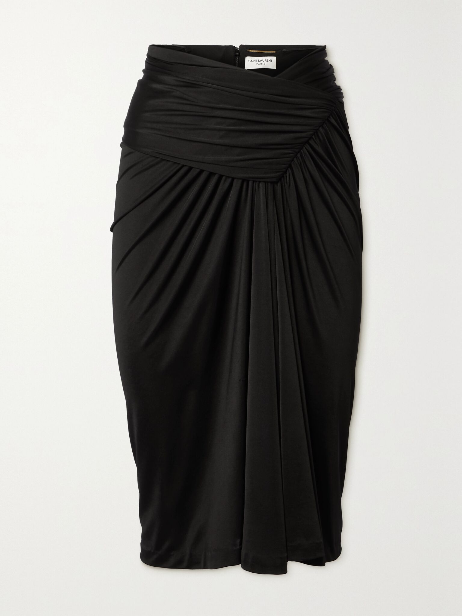 A black skirt can go so far in your wardrobe – SAINT LAURENT elevates the staple to feel fresh and feminine. Made from slinky jersey, it has a ruched, asymmetric front that frames and elongates your figure. Wear yours with a sleek bodysuit and sandals. Size & Fit - Fits true to size, take your normal size - Knee-length, designed to be worn at the waist - Mid-weight, slightly stretchy fabric - Model is 177cm/ 5'10" and is wearing a FR 34 Details & Care - Black jersey - Concealed zip fastening along back - 100% viscose - Dry clean