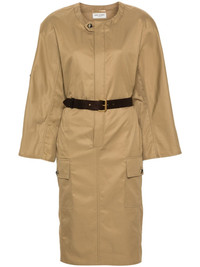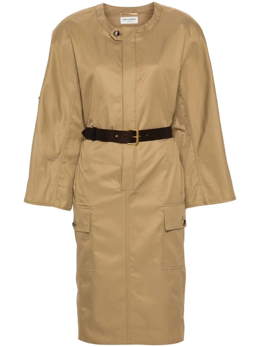 belted cotton twill midi dress Saint Laurent adds its Parisian aesthetic to this beige dress. The cotton-crafted piece has a shirt silhouette accentuated with a leather belt around the waist. Highlights - Beige - Cotton - Twill weave - Round neck - Short sleeves - Turn-up cuffs - Two front flap pockets - Two side inset pockets - Detachable waist leather belt - Straight hem - Mid-length - Front button placket Made in Italy Composition Cotton 100% SIZE & FIT Model measurements Height 5 ft 10 in(1.77 m) Bust/Chest 32.28 in(82 cm) Hips 35.03 in(89 cm) Waist 25.19 in(64 cm) FittingInformation Designed for a relaxed fit, this piece allows for comfort and movement when worn The internal shoulder pads offer a structured shape Made from a midweight non-stretch fabric This piece fits true to size – take your usual size