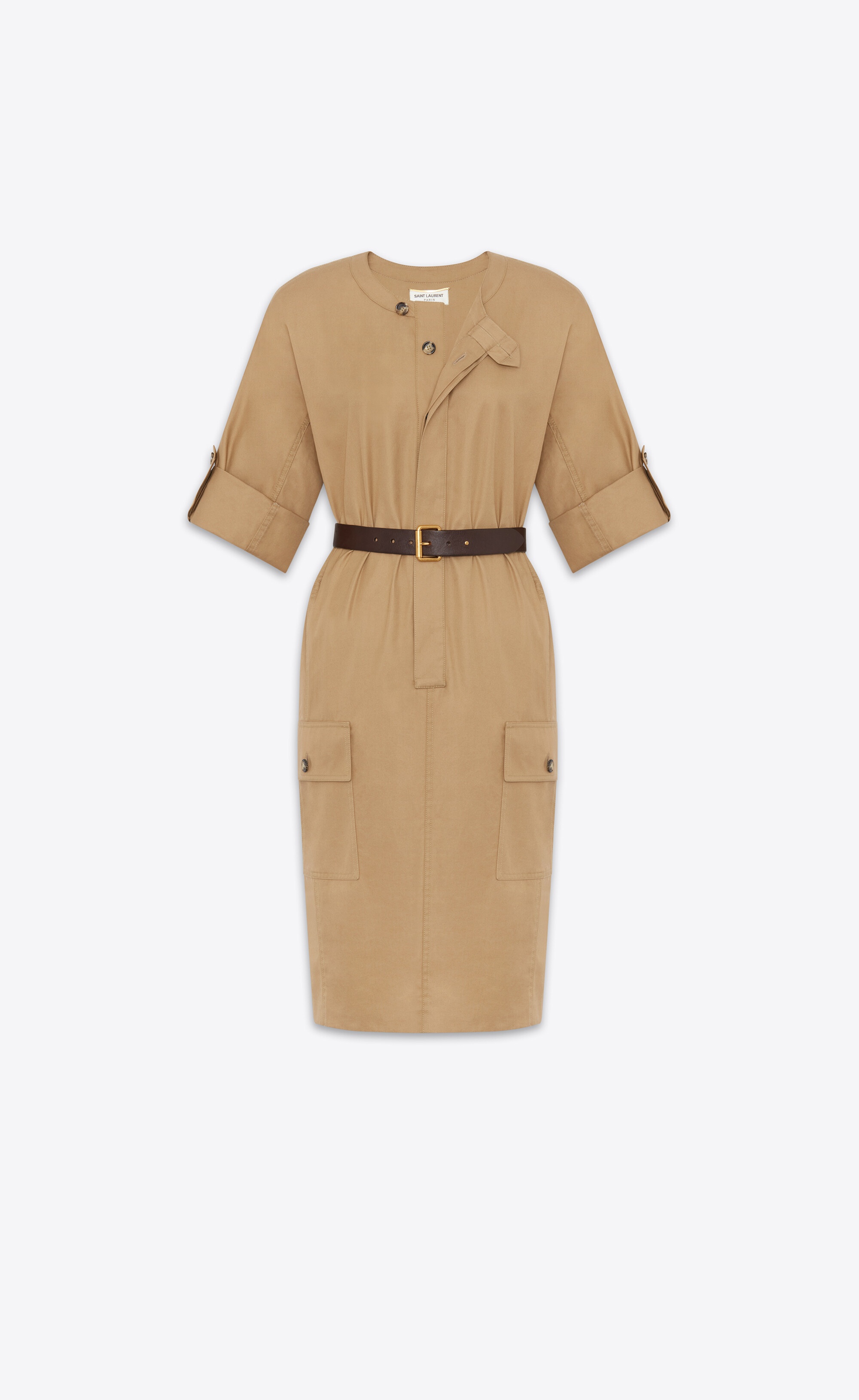 KNEE-LENGTH BELTED DRESS MADE WITH ORGANIC COTTON, FEATURING DROP SHOULDERS AND ¾-LENGTH SLEEVES WITH ROLLED CUFFS AND BUTTON TABS. - 100% COTTON - ORGANIC COTTON - CONCEALED FRONT BUTTON CLOSURE - REMOVABLE PIN-BUCKLE LEATHER BELT - TWO CONCEALED SIDE POCKETS - TWO PATCH POCKETS WITH BUTTON FLAP AT THE SIDES - CREWNECK WITH BUTTON TAB - UPTURNED CUFFS WITH BUTTON TAB - PADDED SHOULDERS - STYLE ID 786339Y3A992611 - MADE IN ITALY