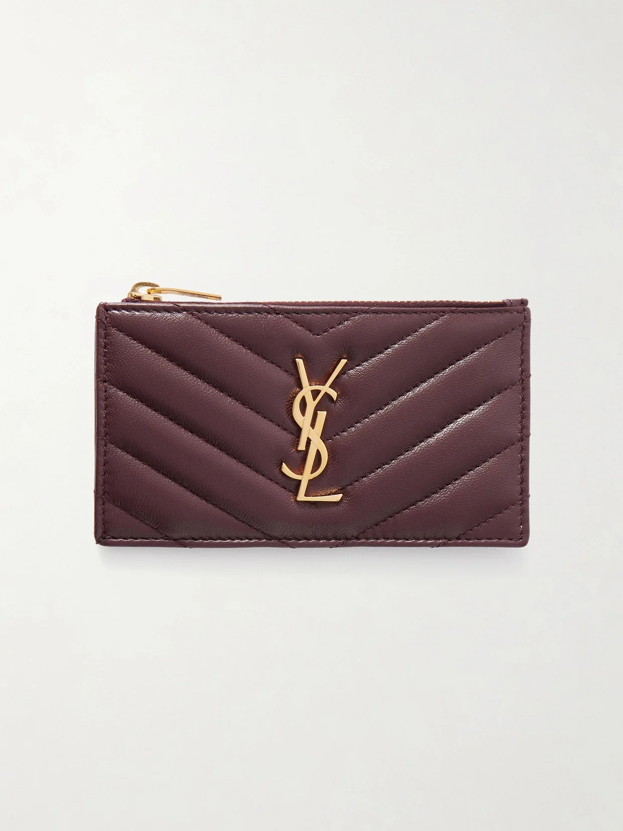 SAINT LAURENT's cardholder has been made in Italy from chevron-quilted textured-leather and embellished with the house's iconic 'YSL' plaque. It's fitted with five card slots and a zipped pocket to keep loose change secure. Slip yours into the coordinating bag.