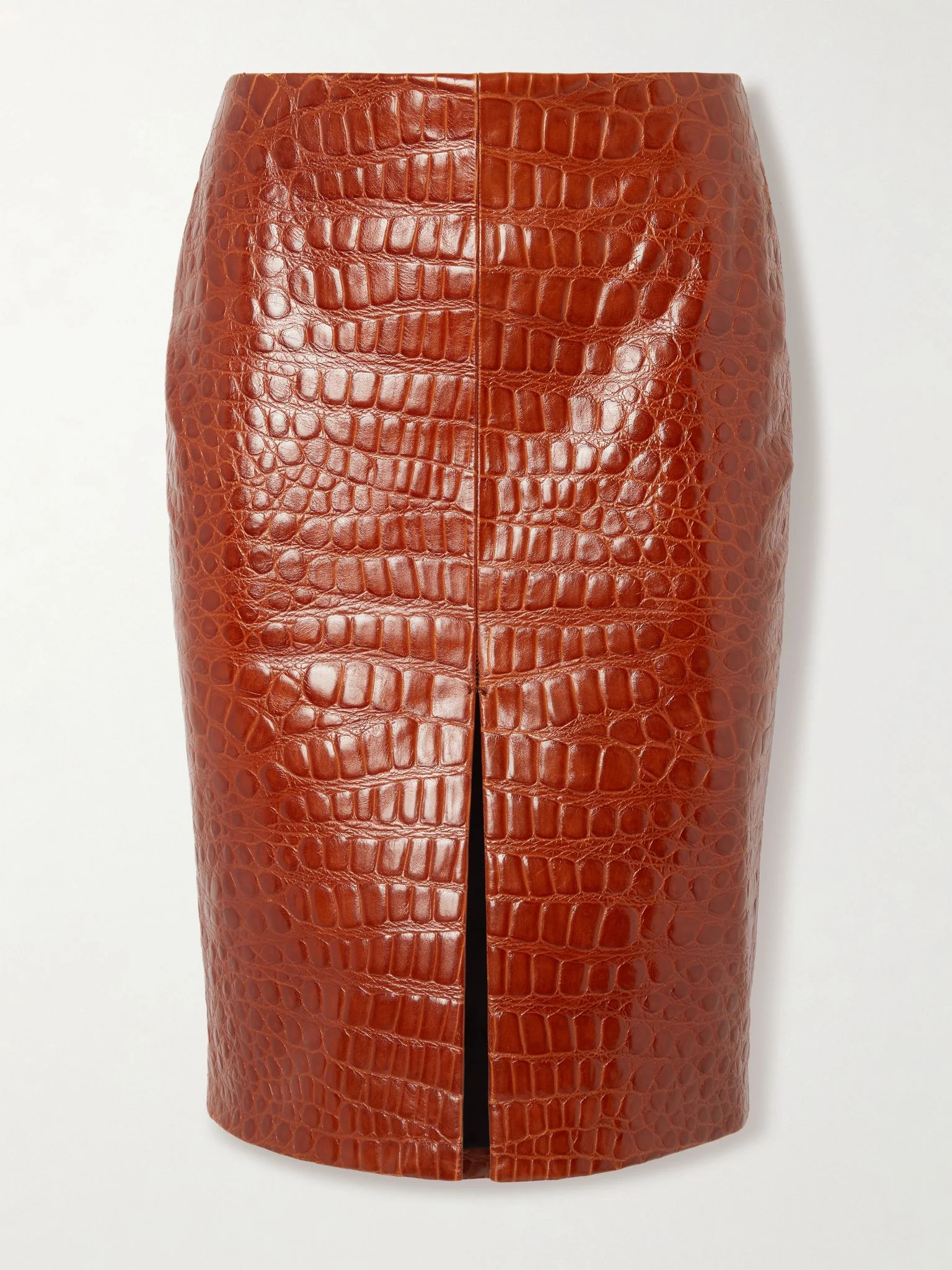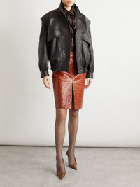 The styling in SAINT LAURENT's Fall '25 lookbook showcases a blend of masculine and feminine elements - case in point, this croc-effect leather pencil skirt was paired with an oversized moto jacket. It's cut for a close fit and has a generous front split. Size & Fit - Fits true to size, take your normal size - Knee-length, designed to be worn at the waist - Firm, non-stretchy leather - Model is 180cm/ 5'11" and is wearing a FR 36 Model measurements: - Bust: 79cm/ 31" - Waist: 60cm/ 23.5" - Hip: 86cm/ 34" Details & Care - Brown croc-effect leather - Concealed hook and zip fastening at back - 100% leather (Cow) - Dry clean
