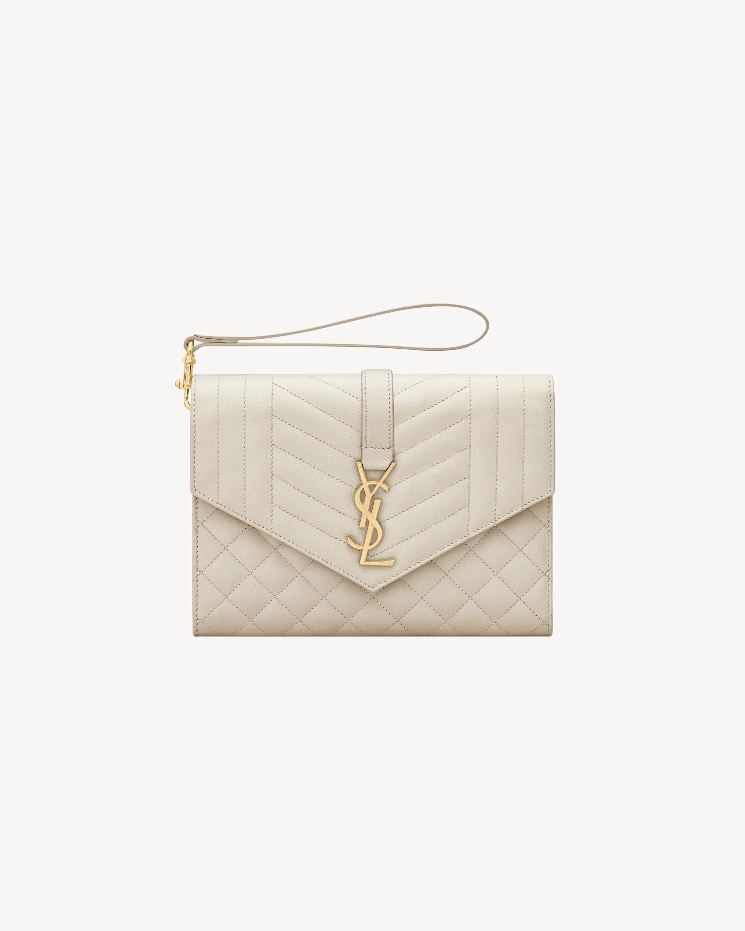 ENVELOPE CLUTCH WITH A FRONT FLAP POUCH MADE WITH METAL-FREE TANNED LEATHER AND ORGANIC COTTON LINING, DECORATED WITH THE CASSANDRE AND A MIX OF VERTICAL, CHEVRON AND CARRE QUILTED OVERSTITCHING, FEATURING A DETACHABLE WRISTLET. - CHROME FREE, METAL FREE TANNED LEATHER AND ORGANIC COTTON LINING - DIMENSIONS: 21 X 16 X 3 CM / 8.2 X 6.2 X 1.1 INCHES - HANDLE DROP: 14 CM - GOLD-TONED METAL HARDWARE - GROSGRAIN LINING - SNAP-BUTTON CLOSURE - INTERIOR: ONE MAIN COMPARTMENT - ONE FLAT POCKET - CALFSKIN LEATHER, BRASS - STYLE ID 651030BOW919207 - MADE IN ITALY
