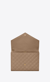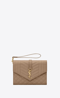ENVELOPE POUCH WITH A FLAP MADE WITH METAL-FREE TANNED LEATHER AND ORGANIC COTTON LINING, DECORATED WITH ICONIC YSL SIGNATURE AND MIX OF VERTICAL, CHEVRON AND CARRÉ-QUILTED OVERSTITCHING, FEATURING A DETACHABLE WRISTLET. - 90% CALFSKIN LEATHER, 10% BRASS - CHROME FREE, METAL FREE TANNED LEATHER - DIMENSIONS: 21 X 16 X 3 CM / 8.3 X 6.3 X 1.2 INCHES - HANDLE DROP: 14 CM / 5.5 INCHES - GOLD-TONED METAL HARDWARE - SNAP-BUTTON CLOSURE - INTERIOR: ONE MAIN COMPARTMENT, ONE FLAT POCKET - GROSGRAIN LINING - STYLE ID 811006093 - MADE IN ITALY