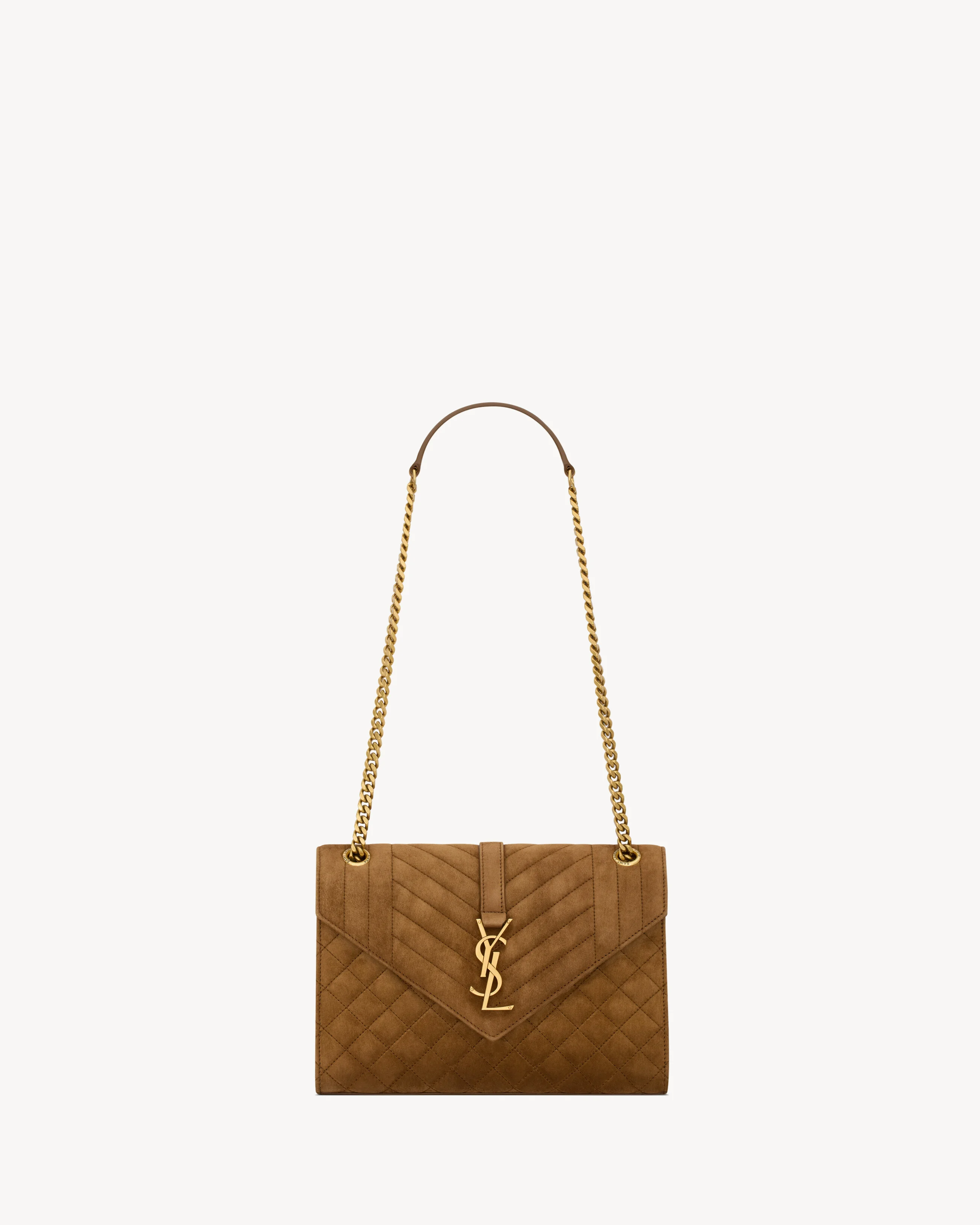 A TIMELESS ENVELOPE BAG IN SUEDE WITH VERTICAL-, CHEVRON-, AND DIAMOND-QUILTED TOPSTITCHING. THIS VERSATILE PIECE FEATURES A SLIDING LEATHER-AND-CHAIN STRAP THAT CAN BE WORN TWO WAYS. - COTTON LINING - BRONZE-TONE HARDWARE - MAGNETIC SNAP CLOSURE - ONE BACK POCKET - ONE FLAT POCKET - DIMENSIONS: 24 X 17.5 X 6 CM / 9.4" X 6.9" X 2.3" - SINGLE-STRAP DROP: 52 CM / 20.4" - DOUBLE-STRAP DROP: 30 CM / 11.8" - CALFSKIN LEATHER, METAL - STYLE ID 6001851U8872916 - MADE IN ITALY