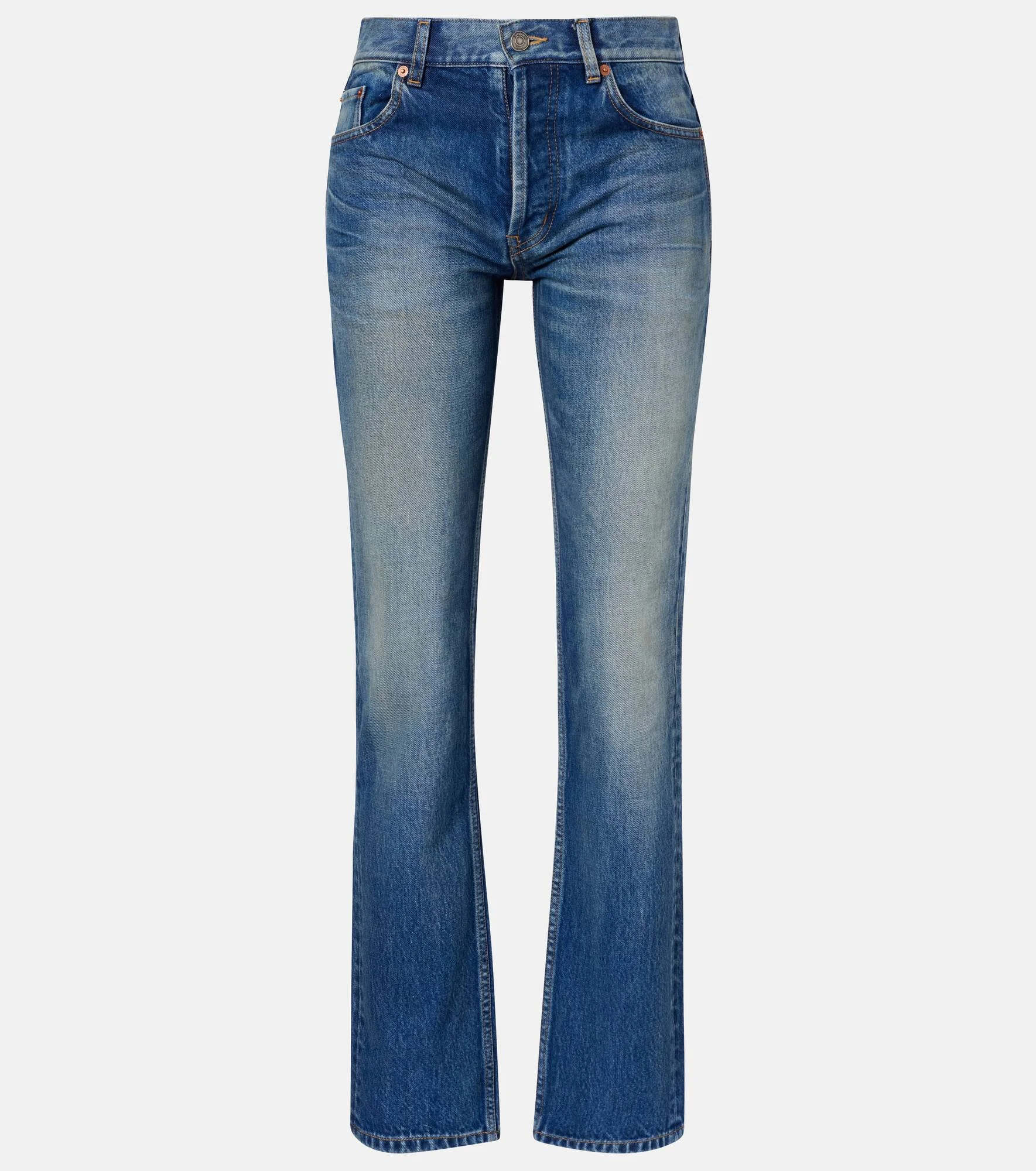 These jeans from Saint Laurent are cut to a relaxed straight silhouette and showcase a faded finish on the front. The design features a classic 5-pocket construction and a leather logo patch at the back. Product Details - Material: 100% cotton - Care instructions: machine wash at 30 degrees - Made in Japan - Color: blue - Designer color name: Ever Vintage Blue - Insert: 100% leather - Contains non-textile parts of animal origin - Pocket lining: 100% cotton - Closure: concealed button placket - Item number: P01128222 Size & Fit - Fits small to size - we recommend trying two sizes larger - Non-stretchy fabric - Straight leg - Mid-rise - The model seen in the picture is 178cm-5'10" and wearing a size 28