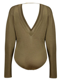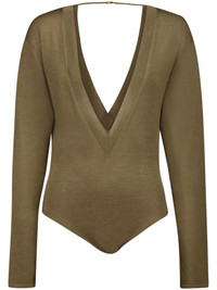 fine-knit bodysuit Highlights - Khaki - Wool - Fine knit - Melange effect - Top clasp fastening - Plunging v-neck - Long sleeves - Fitted waistline - V-back - High cut - Just a reminder that this piece must be tried on over your own garments. Made in Italy Composition Wool 100% Washing instructions Read Manufacturer Guidelines