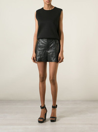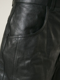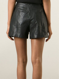 flared shorts Black lambskin flared shorts from Saint Laurent featuring a concealed front fastening, belt loops, two inset pockets to the sides and two back patch pockets. Made in Italy Composition Lining: Silk 100% Lamb Skin 100% SIZE & FIT Model measurements Height 5 ft 11 in(1.8 m) Bust/Chest 31.49 in(80 cm) Hips 35.82 in(91 cm) Waist 24.8 in(63 cm) Washing instructions Specialist Cleaning