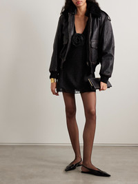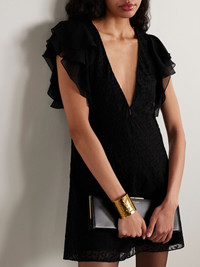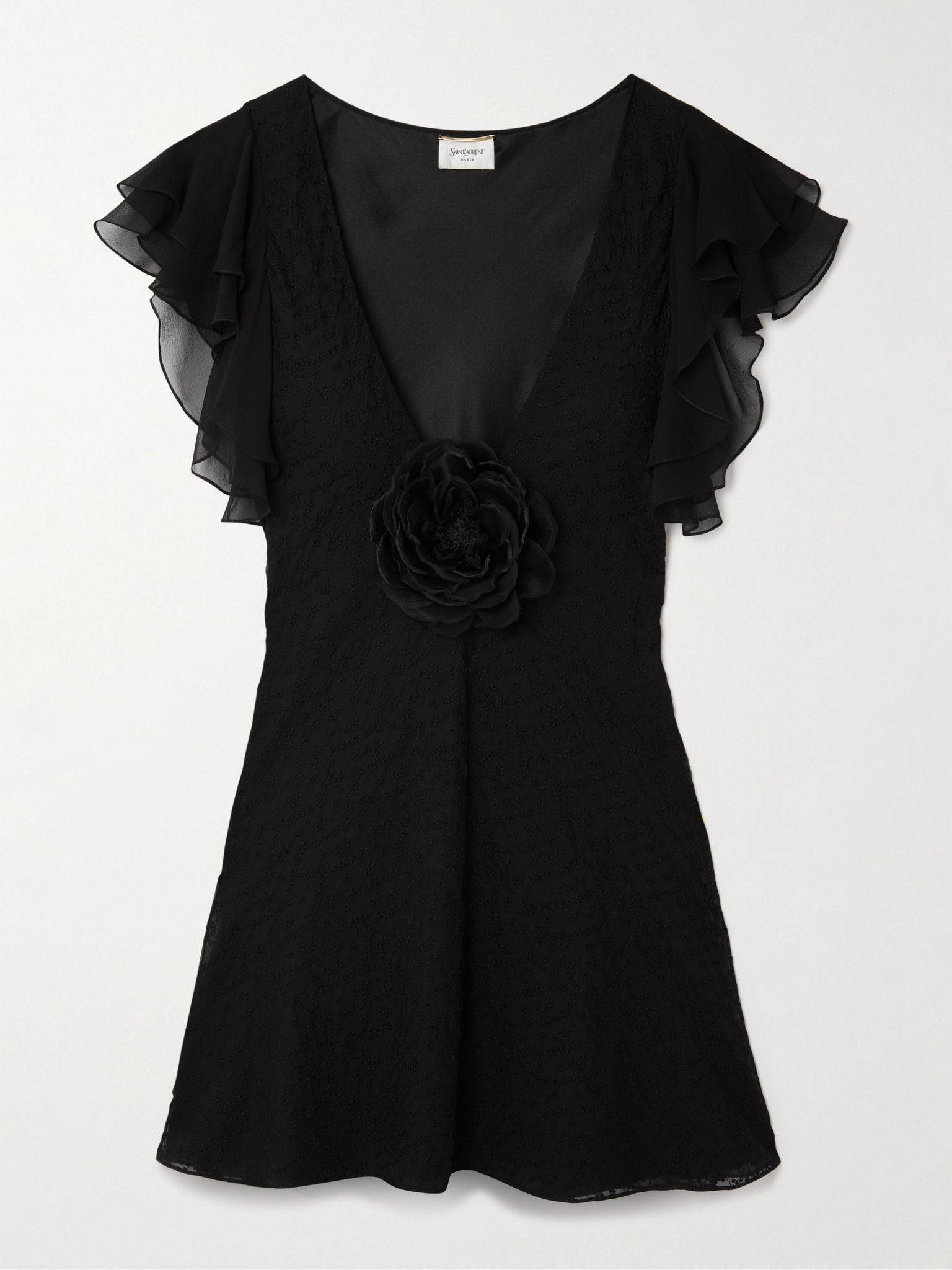 SAINT LAURENT's mini dress has a moody, romantic feel. It's been made in Italy from broderie anglaise cotton-blend voile and has a detachable flower brooch and fluttery silk-chiffon sleeves. Complete your outfit with pumps and a mini bag. Size & Fit - Fits true to size, take your normal size - Designed to be slightly fitted at the bust and waist, loose at the hip - Lightweight, non-stretchy fabric - Model is 175cm/ 5'9" and is wearing a FR 36 Details & Care - Black broderie anglaise cotton-blend voile and silk-chiffon - Slips on - 61% cotton, 33% silk, 6% polyester; trim: 100% silk - Fully lined - Dry clean