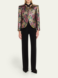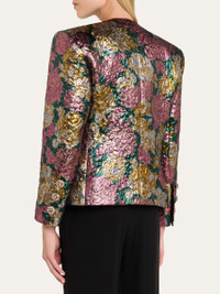 Designed from a metallic floral brocade, this jacket by Saint Laurent is finished with flower-shaped crystal buttons Collarless neckline; button front Padded shoulders Long sleeves; button front Hip welt pockets Relaxed fit Hip length Wool/metallic fibers/polyester Made in France Online Inquiries: BGS21_BA997| Store Inquiries: #5059366
