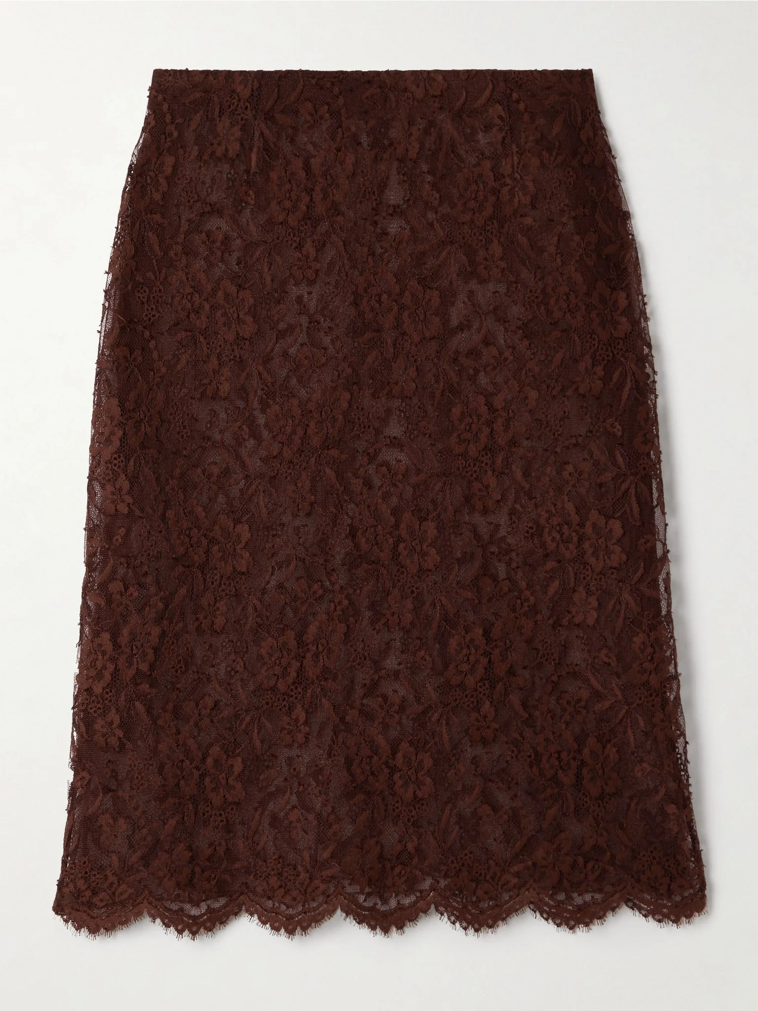 Inspired by lingerie, SAINT LAURENT's skirt is cut from floral lace and intentionally left unlined - underpin yours with tonal briefs or a slip if you prefer more coverage. It sits at your natural waist and falls to a scalloped midi hem. Size & Fit - Fits true to size, take your normal size - Falls above the knee, designed to be worn just below the natural waist - Lightweight, slightly stretchy fabric - Model is 177cm/ 5'10" and is wearing a FR 36 Details & Care - Chocolate lace - Slips on - 40% cotton, 36% polyamide, 24% viscose