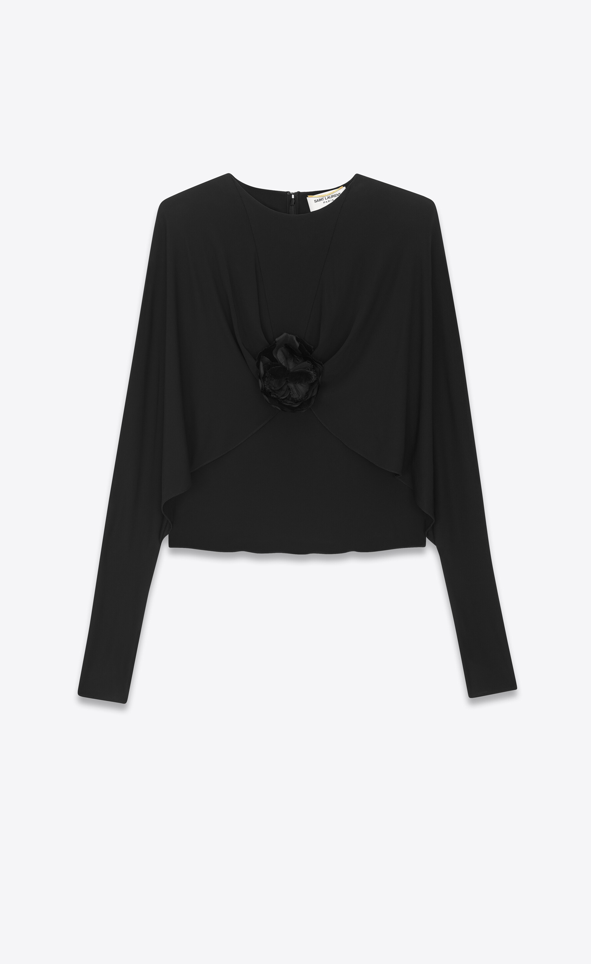 LONG-SLEEVE TOP MADE WITH VISCOSE FROM CERTIFIED SUSTAINABLY MANAGED FORESTS, FEATURING CAPE SLEEVES AND A FLORAL DETAIL ON THE CHEST. - 100% VISCOSE - VISCOSE FROM CERTIFIED SUSTAINABLY MANAGED FORESTS - ZIP AND HOOK CLOSURE AT THE BACK OF THE NECK - ROUND NECK - PADDED SHOULDERS - STYLE ID 720676Y7F931000 - MADE IN ITALY