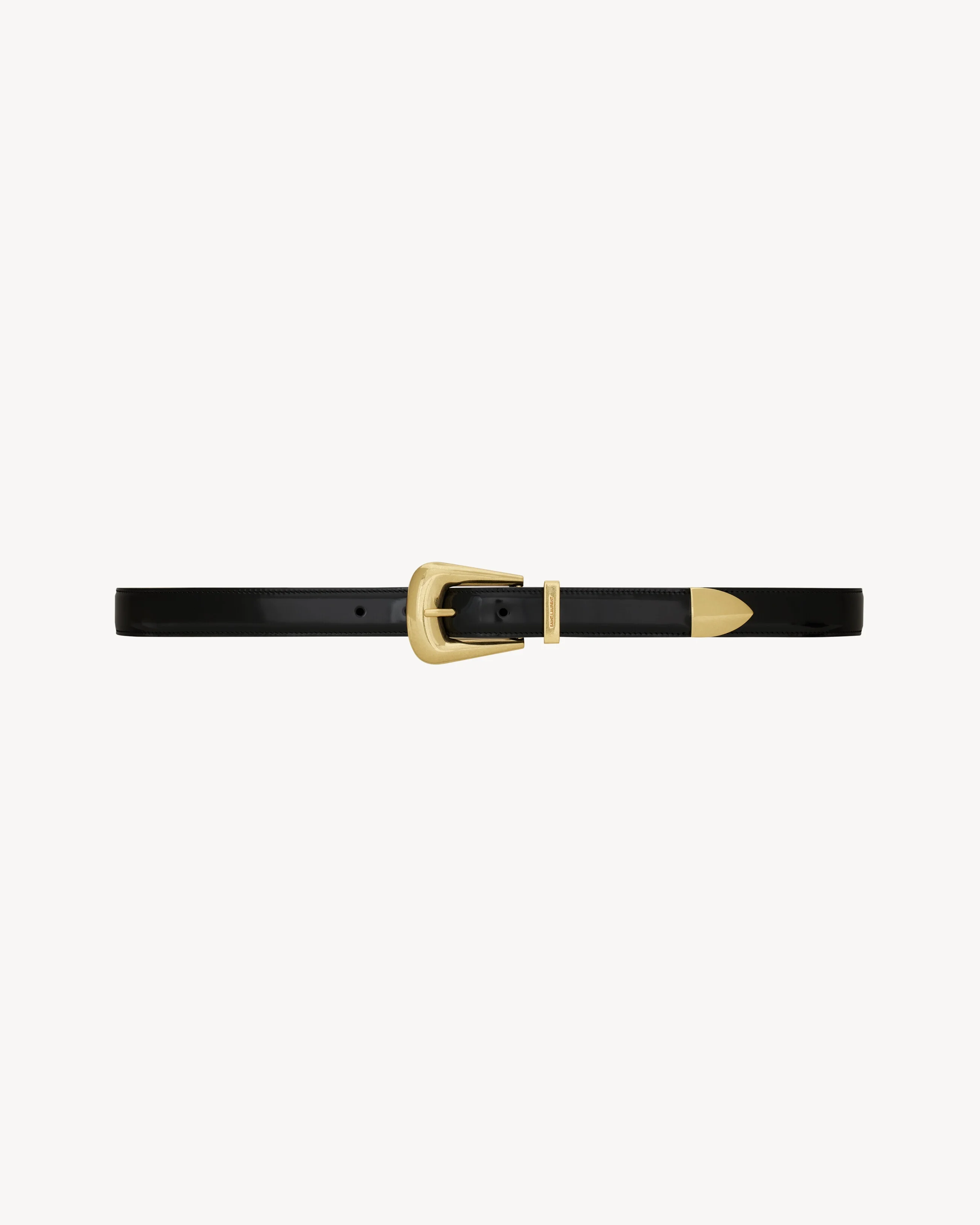 BELT FEATURING A FOLK BUCKLE, SAINT LAURENT ENGRAVED METAL LOOP AND POINTED METAL END TIP. - 95% CALFSKIN LEATHER, 5% METAL - DIMENSIONS: 2.5 CM / 1 INCH - GOLD-TONED HARDWARE - ADJUSTABLE BUCKLE CLOSURE - STYLE ID 756414AACUU1000 - MADE IN ITALY