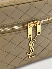 EDITORS'NOTES Like many of the designs in SAINT LAURENT's 'Gaby' collection, this mini bag is made from smooth quilted leather and embellished with its iconic gold-tone 'Cassandre' logo. You can carry it by the top handle or style it cross-body with the detachable strap. It will accommodate all of your small essentials, including a phone, cardholder, and keys. SIZE & FIT This item’s measurements are: - Min. Strap Length: 101cm / 39.8in - Handle Drop: 5cm / 2in - Depth: 6.5cm / 2.6in - Height: 11cm / 4.3in - Width: 17.5cm / 6.9in DETAILS & CARE - Green leather (Lamb) - Top handle, detachable shoulder strap - Internal slip pocket - Fully lined - Zip fastenings along front and sides