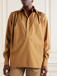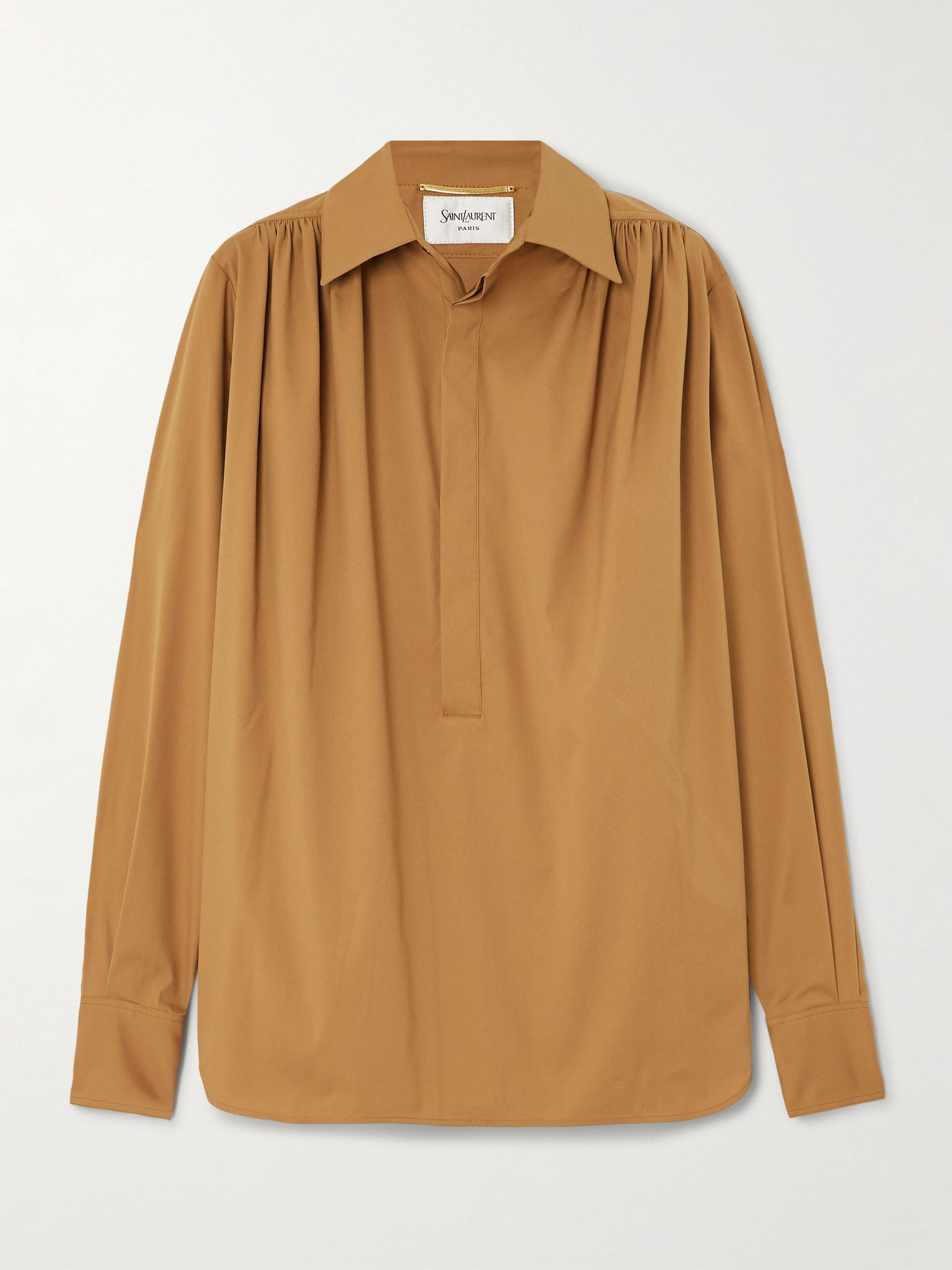 SAINT LAURENT’s blouse is made from a lightweight cotton-blend that’s softly gathered along the yoke to enhance the floaty shape. It has a neat collar and a partially concealed placket for a refined finish. Size & Fit - Fits true to size, take your normal size - Designed for a relaxed fit - Lightweight, non-stretchy fabric - Model is 177cm/ 5'10" and is wearing a FR 36 Model measurements: - Bust: 81cm/ 32" - Waist: 62cm/ 24.5" - Hip: 89cm/ 35" Details & Care - Marigold cotton-blend - Partially concealed button fastenings along front - 79% cotton, 16% polyamide, 5% elastane - Dry clean