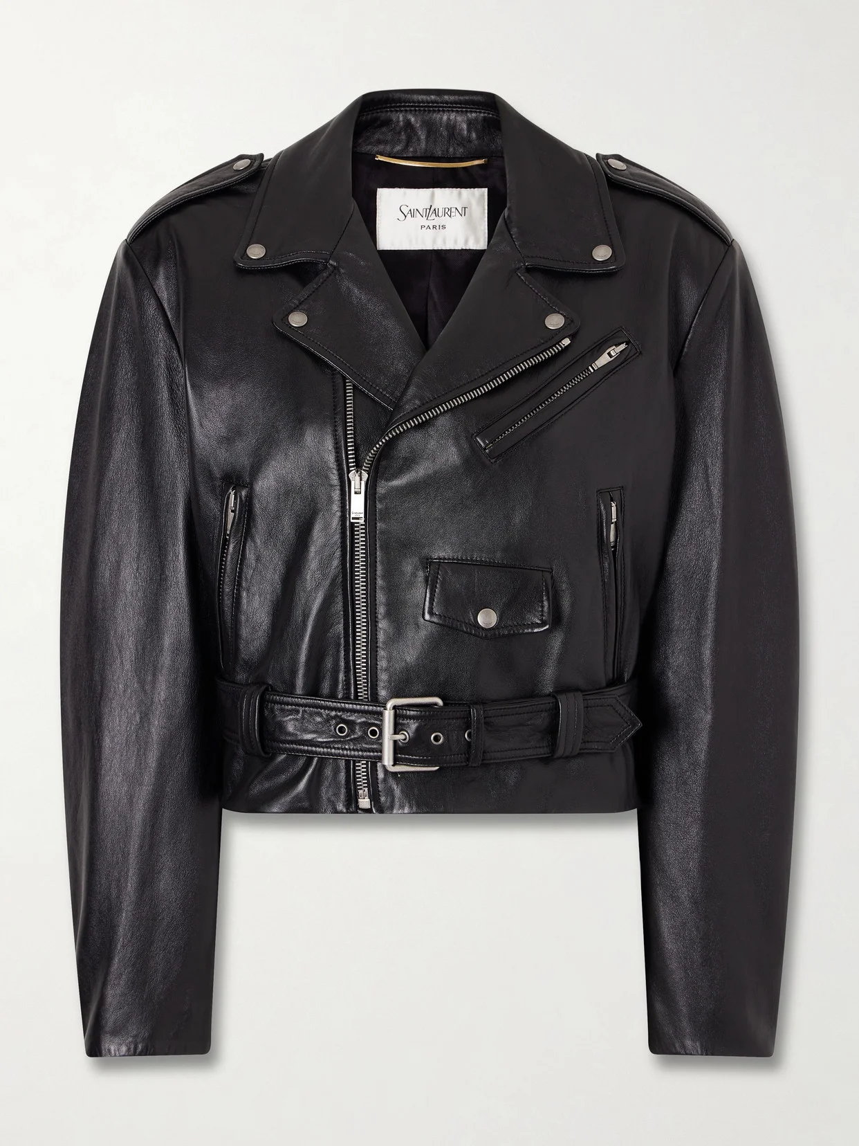 Saint Laurent is synonymous with its directional use of leather. Made in Italy, this glossy biker jacket is cut to a cropped profile with curved shoulders that nod to the house's '80s influences. Polished silver-tone hardware enhances the sleek feel, while a belt subtly defines the waist.