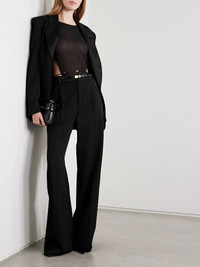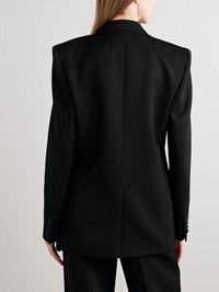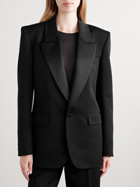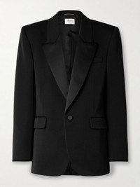 SAINT LAURENT's blazer is designed with lustrous satin lapels which are reminiscent of traditional tuxedos. Tailored in Italy from black wool, it has a slightly loose shape, angular padded shoulders and decorative buttoned cuffs. The full lining ensures smooth layering. Size & Fit - Fits true to size, take your normal size - Intended for a slightly loose fit - Internal shoulder pads - Mid-weight, non-stretchy fabric - Model is 177cm/ 5'10" and is wearing a FR 36 Model measurements: - Bust: 79cm/ 31" - Waist: 61cm/ 24" - Hip: 88.9cm/ 35" Details & Care - Black wool and satin - Button fastening at front - 100% wool; trim: 100% polyester; lining1: 100% silk; lining2: 97% cotton, 3% elastane - Dry clean