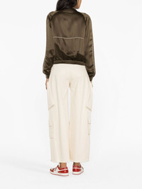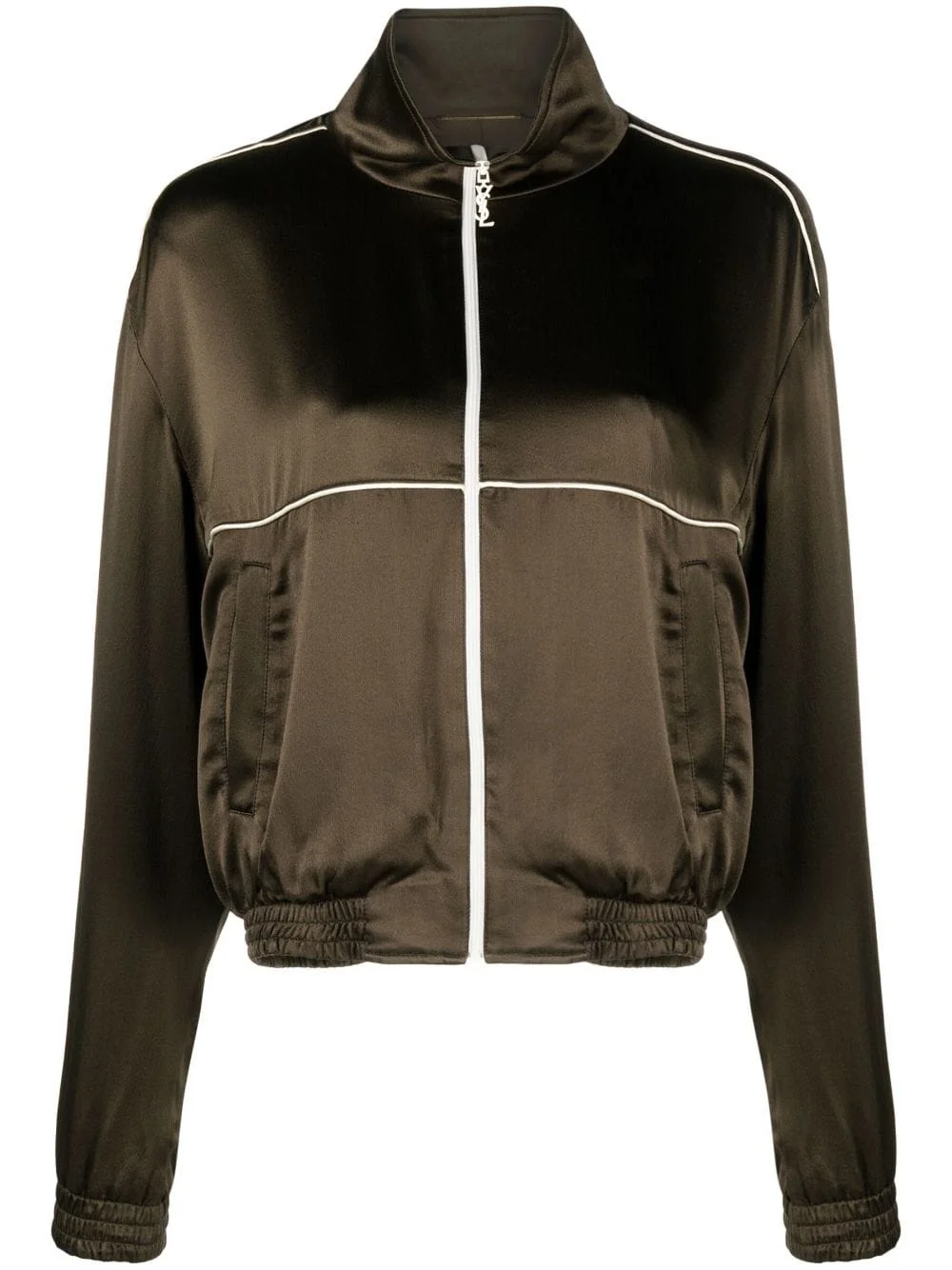 high-neck silk track jacket Yves Saint Laurent crafts an athletic silhouette with luxurious silk satin, merging the lines between leisurewear and luxury. Rendered in a brown hue, the jacket features a logo charm at the zip for a subtle branded touch. Highlights - Brown - Silk - Satin finish - High neck - Logo charm - Front zip fastening - Long sleeves - Elasticated cuffs - Two side welt pockets - Elasticated hem - Straight hem Made in Italy Composition Outer: Silk 100% Lining: Cupro 100% SIZE & FIT Model measurements Height 5 ft 10 in(1.78 m) Bust/Chest 31.49 in(80 cm) Hips 35.03 in(89 cm) Waist 23.62 in(60 cm) FittingInformation Designed for a relaxed fit, this piece allows for comfort and movement when worn Made from a midweight non-stretch fabric, this piece offers minimal elasticity when worn This piece fits true to size – take your usual size