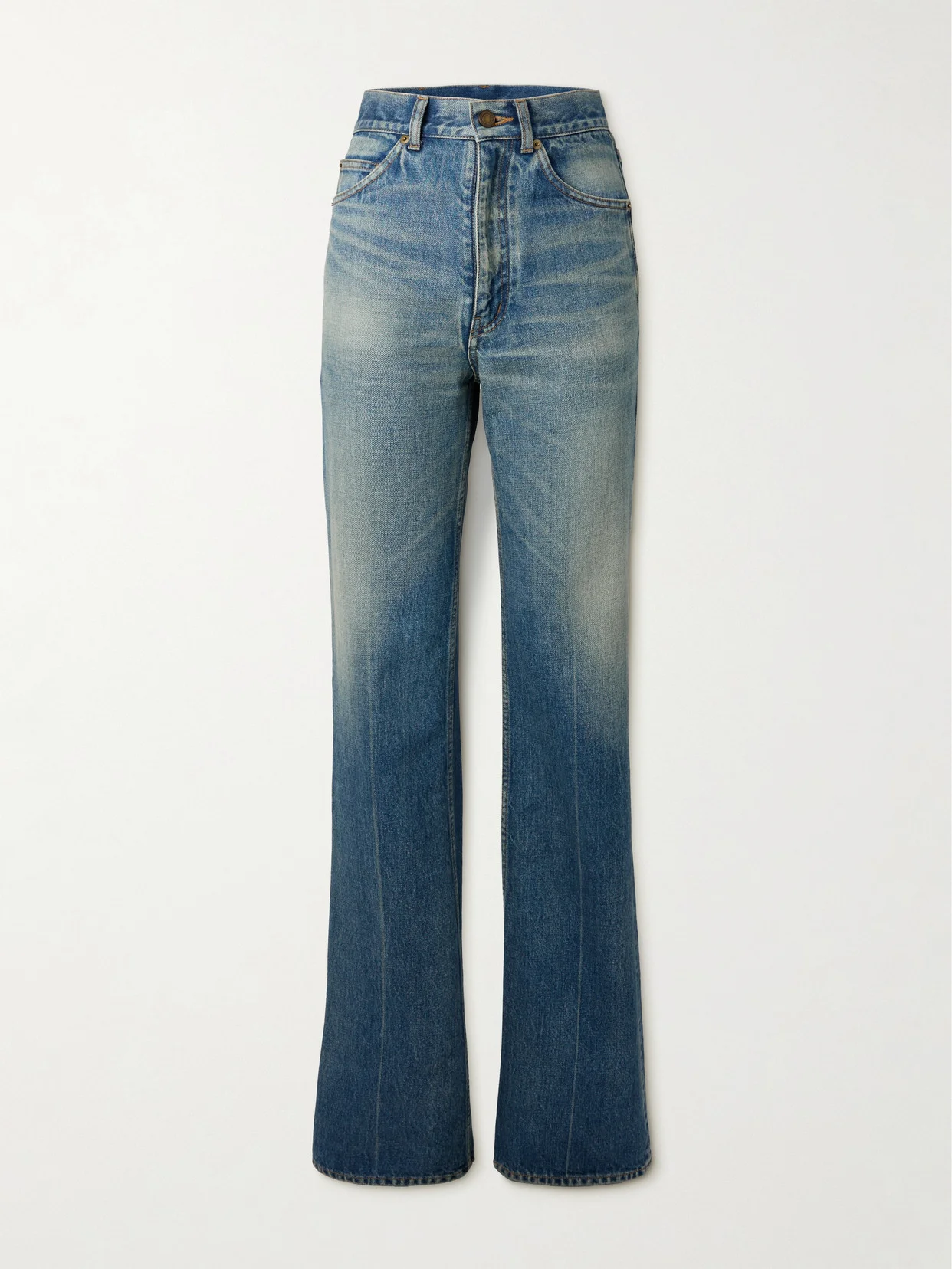 SAINT LAURENT's jeans are inspired by '70s styles, with their particularly high rise and bootcut legs. They're made from denim that's whiskered and faded to look authentically lived-in and have a classic five-pocket construction. Wear yours with heels to lift the floor-pooling hems.
