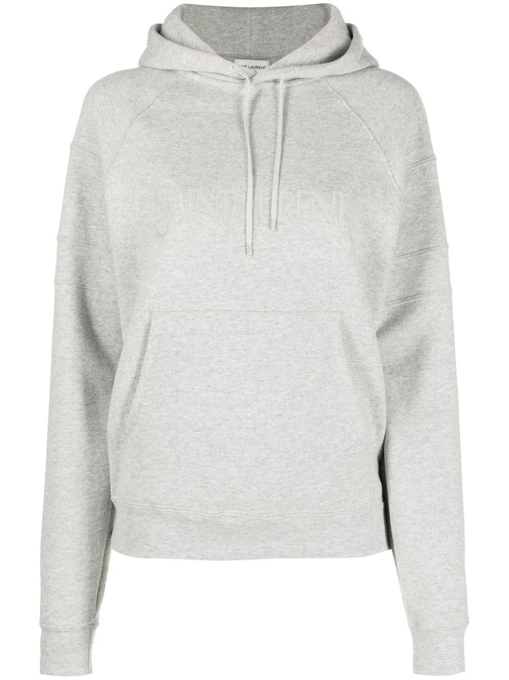 embroidered-logo cotton hoodie A classic hoodie from Saint Laurent. Note the front pouch pocket and drawstrings at the collar, all rendered in recognisable grey marl. Made in France Composition Outer: Polyester 10% Fabric 100% SIZE & FIT Model measurements Height 5 ft 10 in(1.79 m) Bust/Chest 31.49 in(80 cm) Hips 35.03 in(89 cm) Waist 23.62 in(60 cm) Measurement SLEEVE LENGTH 23.22 in(59 cm) LENGTH 24.4 in(62 cm) WAIST 34.64 in(88 cm) BUST 39.37 in(100 cm) FittingInformation This piece fits true to size. We recommend you get your regular size Cut for a loose fit Made with a mid-weight fabric Washing instructions Dry Clean Only