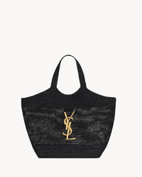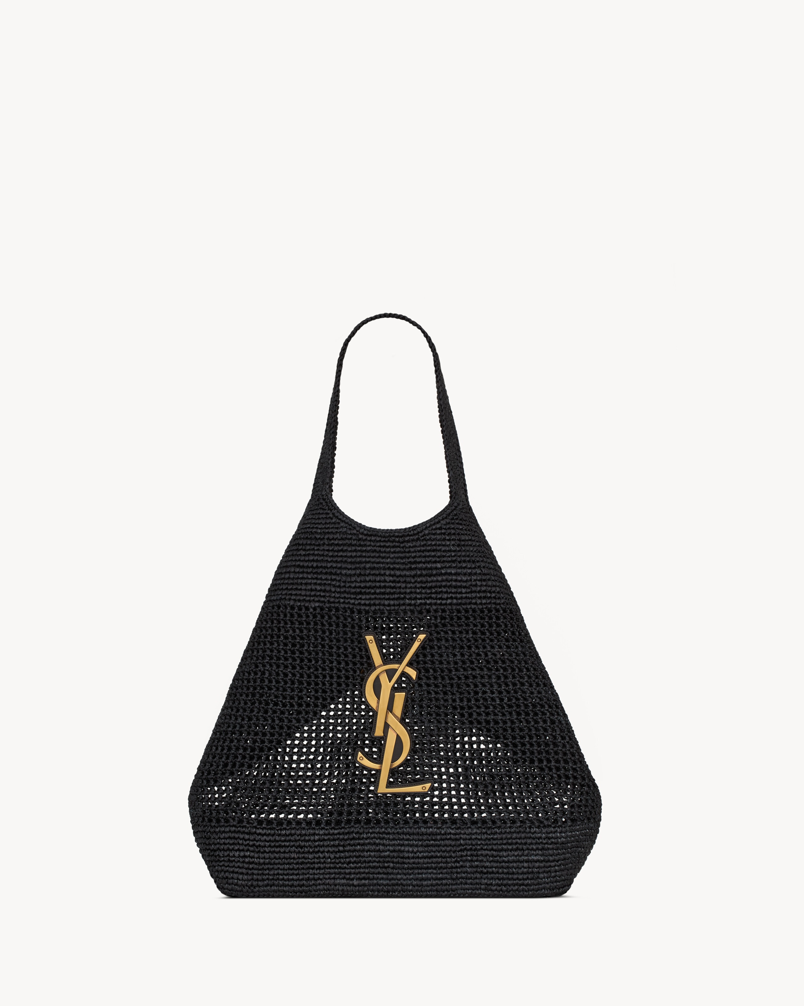 MAXI TOTE IN NATURAL RAFFIA AND VEGETABLE-TANNED LEATHER, CROCHETED ENTIRELY BY HAND. THIS TECHNIQUE REQUIRES HIGHLY SPECIALIZED ARTISANS AND EXCEPTIONAL SAVOIR FAIRE. THE FRONT IS ADORNED WITH A DELICATELY PLACED OVERSIZED CASSANDRE, WHILE INNER TIES ALLOW THE SIDES TO BE COLLAPSED OR EXPANDED AS DESIRED. INCLUDES A REMOVABLE RAFFIA SUNGLASSES CASE AFFIXED WITH A LONG CHAIN. - BRONZE-TONE HARDWARE - REMOVABLE SUNGLASSES CASE - DIMENSIONS: 37–55 X 43 X 5 CM / 14.6–21.7 X 16.9 X 2 INCHES - HANDLE DROP: 22 CM / 8.7 INCHES - 90% RAFIA 10% METAL - STYLE ID 772191GAAFM1000 - MADE IN MADAGASCAR