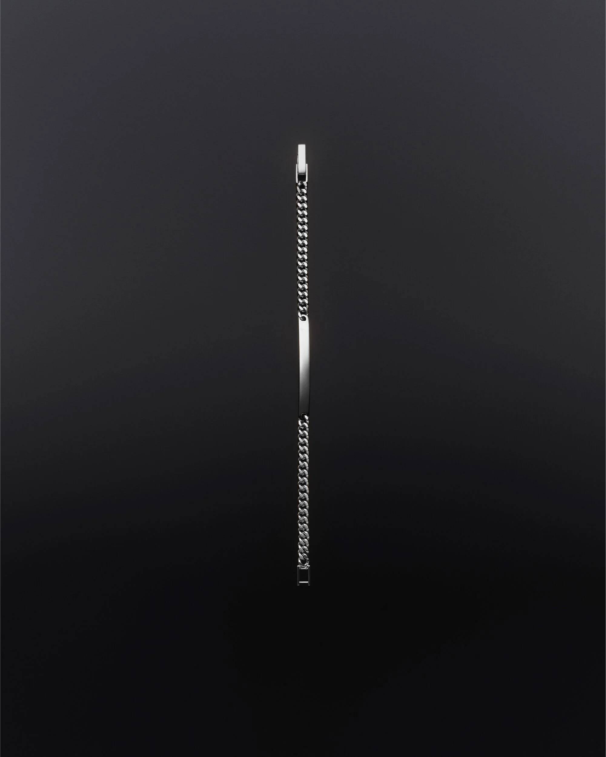 FACETED CURB-CHAIN BRACELET WITH A BLANK ID BAR, MADE WITH RECYCLED GOLD. GOLD IS A PRECIOUS MATERIAL THAT IS MALLEABLE AND HIGHLY SENSITIVE TO SCRATCHING. THE PRODUCT IS EXPECTED TO EVOLVE AND PRESENT MARKS THROUGHOUT ITS LIFECYCLE. MOREOVER, AS GOLD IS A SOFT ALLOY, PIECES SHOULD NOT BE STACKED ONE ON TOP OF THE OTHER TO AVOID DAMAGING THEM. EVERY PIECE OF JEWELRY MUST BE STORED IN ITS ORIGINAL PACKAGING TO AVOID ANY FRICTION WITH OTHER OBJECTS THAT COULD SCRATCH IT. WHEN PART OF A SET, PIECES MUST BE STOCKED SEPARATELY. - RECYCLED GOLD - FOLD OVER CLASP - SAINT LAURENT ENGRAVING ON THE INSIDE - DIMENSIONS: SIZE S 16 CM / 6.3 INCHES; SIZE M 17 CM / 6.7 INCHES - 18KT GREY GOLD 750/1000 - STYLE ID 763635Y80028126 - MADE IN ITALY