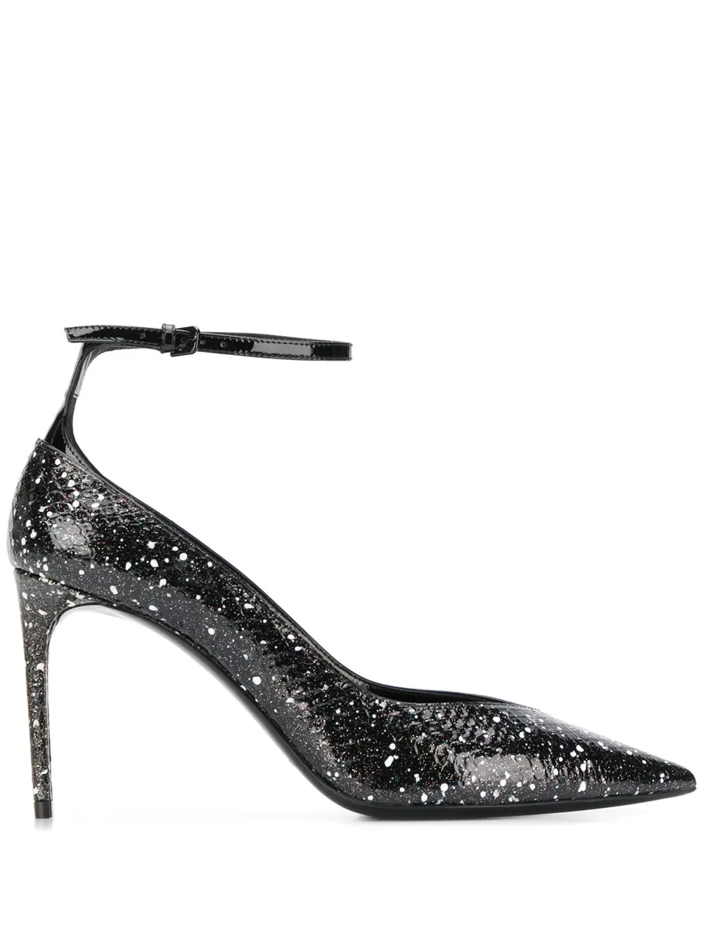 ink splashes pumps Yes, you are an artist. But you're also a girl who likes her high heels. Mix and match your personality with these black leather ink splashes pumps from Saint Laurent and show the artist in you. Mrs. Big Artiste. Featuring a pointed toe, a branded insole, an ankle strap with a side buckle fastening, a high stiletto heel and white ink splashes all-over. Made in Italy Composition Outer: Calf Leather 100% Lining: Calf Leather 100% Sole: Calf Leather 100% SIZE & FIT Measurement CIRCUMFERENCE 8.66 in(22 cm) HEEL 3.93 in(10 cm) HEIGHT 3.14 in(8 cm) Sole height 0.39 in(1 cm)