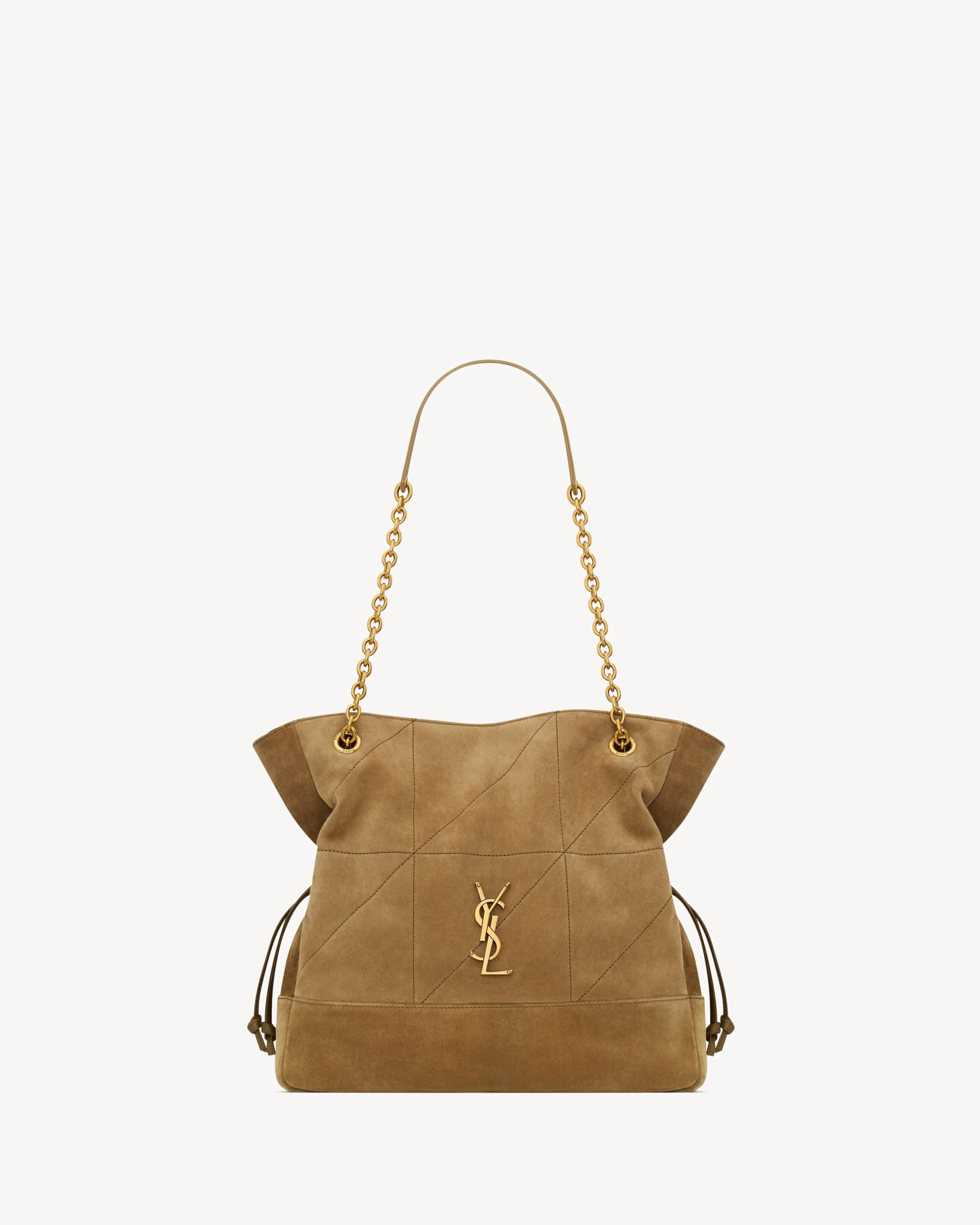 THE SMALL TOTE VERSION OF THE JAMIE IN SUEDE, DECORATED WITH THE CASSANDRE AND CARRE RIVE GAUCHE TOPSTITCHING. THIS LIGHTWEIGHT BAG FEATURES A REMOVABLE ZIP POUCH AND A CHAIN STRAP FOR SHOULDER CARRY. DRAWSTRING TIES ALLOW THE SIDES TO BE CINCHED OR EXPANDED TO CREATE DIFFERENT SILHOUETTES. - GROSGRAIN LINING - BRONZE-TONE HARDWARE - MAGNETIC CLOSURE - DIMENSIONS: 29 X 28 X 8 CM / 11.4" X 11" X 3.1" - STRAP DROP: 26 CM / 10.2" - 90% LAMBSKIN 10% BRASS - STYLE ID 8339481U8P73194 - MADE IN ITALY