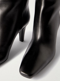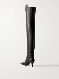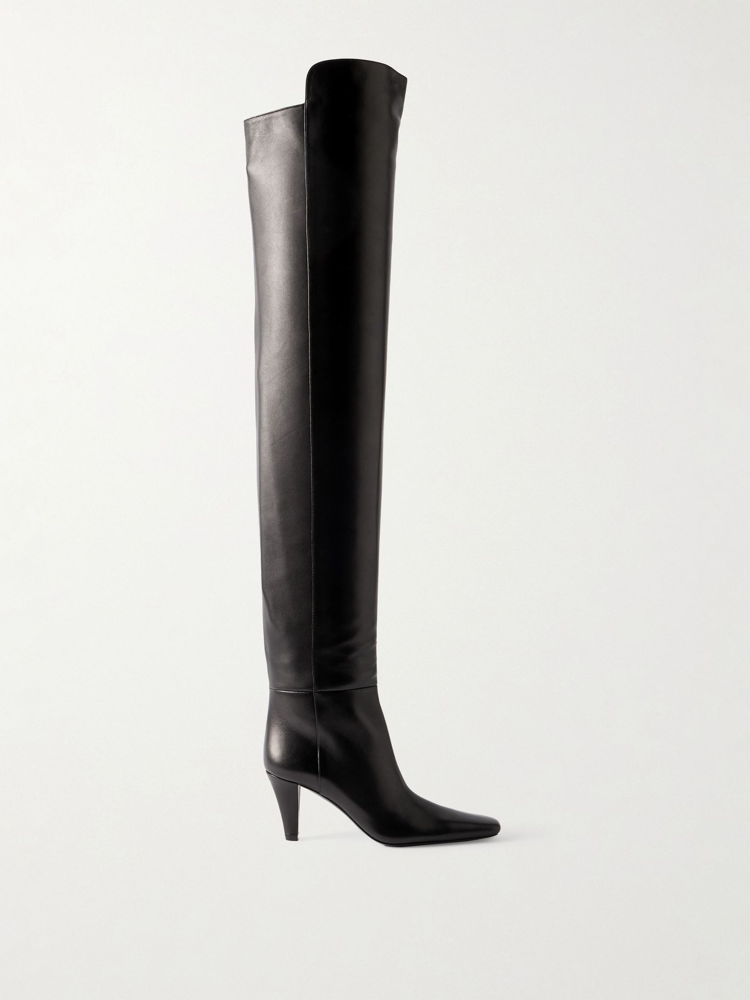 SAINT LAURENT's 'Jill' boots are as sleek as they come. Crafted in Italy from panels of black leather, they have elongated squared toes and rest on tapered 75mm heels. Wear yours with mini skirts and shorts to show off the thigh-high profile and asymmetric hems. Details & Care - Heel measures approximately 75mm/ 3 inches - Black leather (Calf) - Pull on