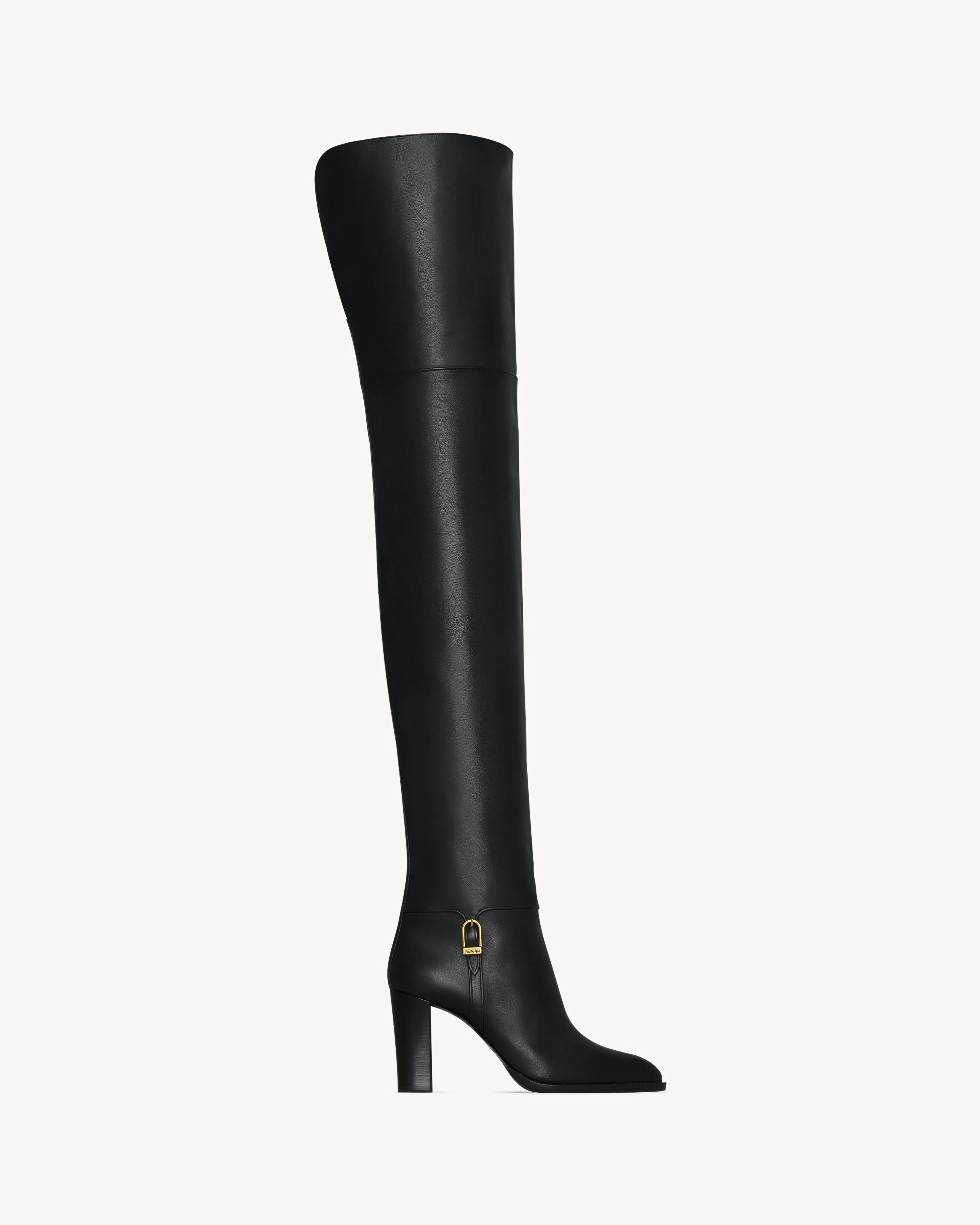 OVER-THE-KNEE BOOTS WITH A SQUARE TOE AND BLOCK HEEL, FEATURING A SAINT LAURENT ENGRAVED BUCKLE AND REAR THIGH SPLIT. - LEATHER SOLE - HEEL HEIGHT: 8.5 CM / 3.3 INCHES - 90% CALFSKIN, 10% BRASS - STYLE ID 840702AAFBC1000 - MADE IN ITALY