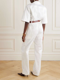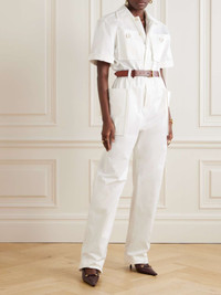 EDITORS'NOTES SAINT LAURENT's Spring '24 collection pays tribute to female aviators and pilots. Inspired by their utility style, this jumpsuit is cut from cotton-twill and detailed with patch pockets and padded shoulders. It comes with a brown leather belt to draw it in. SIZE & FIT Model measurements: - Fits true to size, take your normal size - Designed for a slightly loose fit with straight-leg pants - Use the belt to cinch in at the waist - Mid-weight, non-stretchy fabric - Model is 177cm/ 5'10" and is wearing a FR 36 - Bust: 82cm/ 32.5" - Waist: 66cm/ 26" - Hip: 90cm/ 35.5" DETAILS & CARE - White cotton-twill, brown leather - Concealed button fastenings along front - 100% cotton; belt: 100% leather (Cow); buttons: 100% horn (Buffalo) - Machine wash