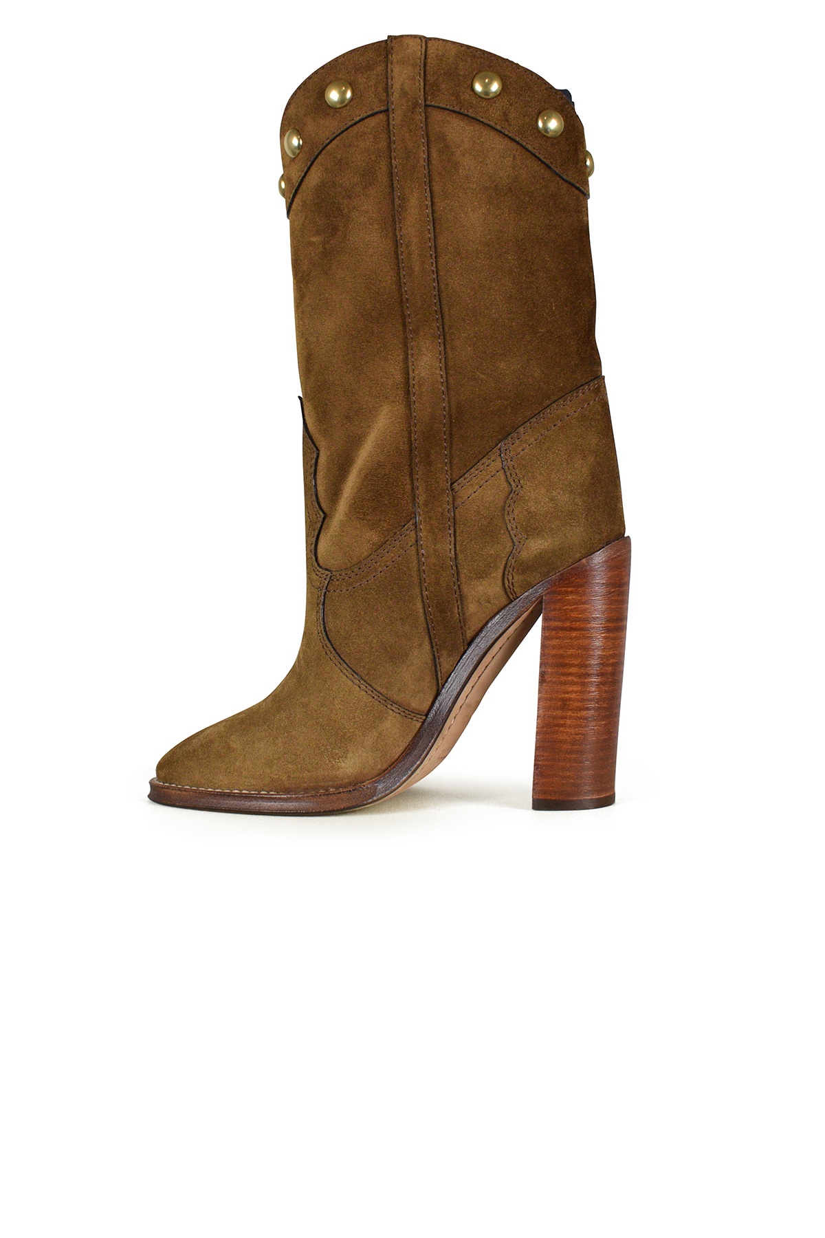 Saint Laurent boots model Kate in gold suede. Embellished with tone-on-tone western-inspired stitching. 10 cm thick heel. Gold metal finishes. Almond toe. Made in Italy.