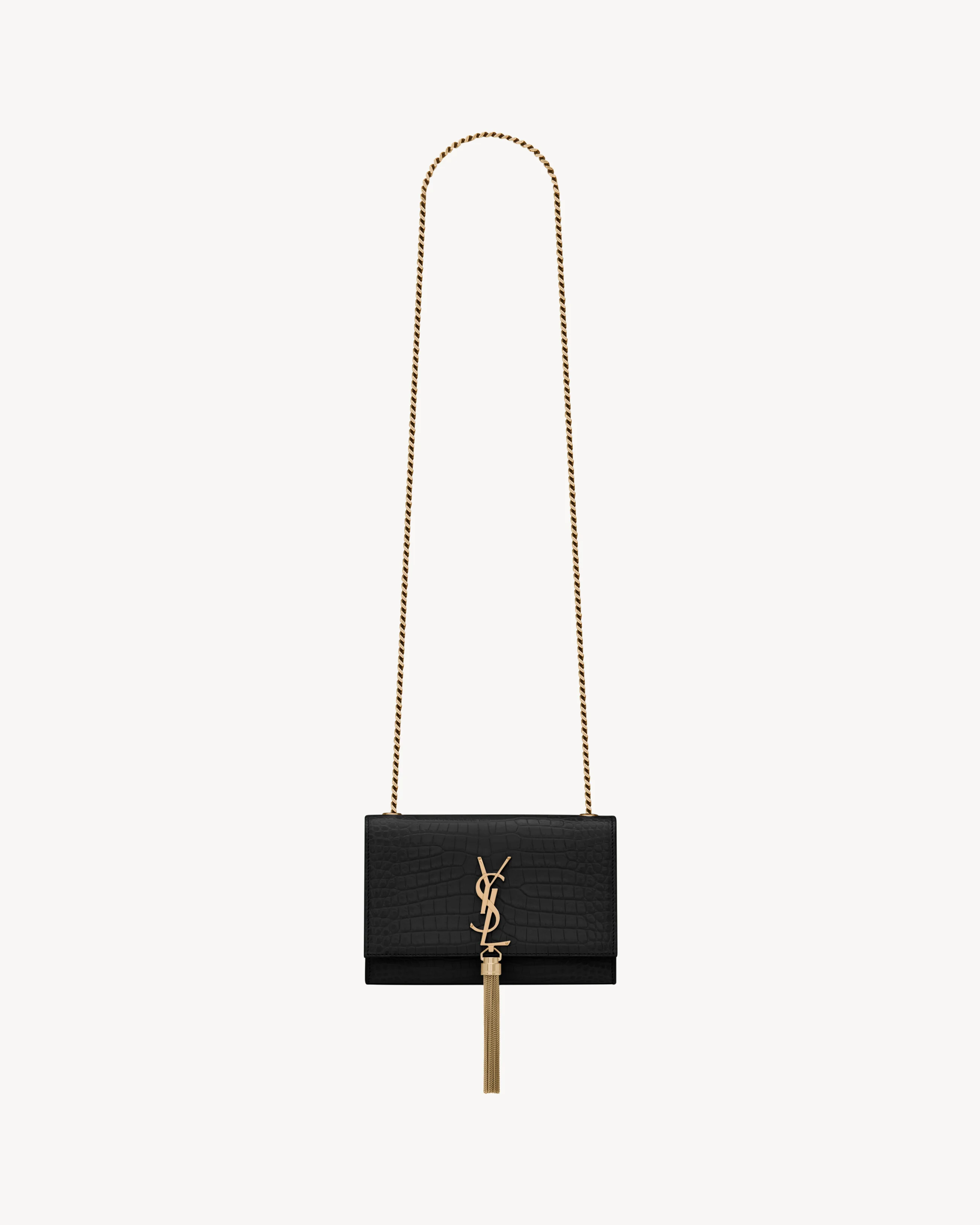SMALL, ICONIC KATE BAG IN SHINY CROCODILE-EMBOSSED LEATHER FEATURING THE CASSANDRE AND CHAIN TASSEL, WITH A LONG, CURB-LINK CHAIN STRAP THAT CAN BE WORN SEVERAL WAYS. - GROSGRAIN LINING - LIGHT BRONZE BRASS HARDWARE - MAGNETIC SNAP TAB - ONE INTERIOR SLOT POCKET - DIMENSIONS: 9.4 X 5.7 X 2.1 INCHES - CHAIN LENGTH: 18.8 INCHES - CALFSKIN LEATHER - STYLE ID 474366DND0J1000 - MADE IN ITALY