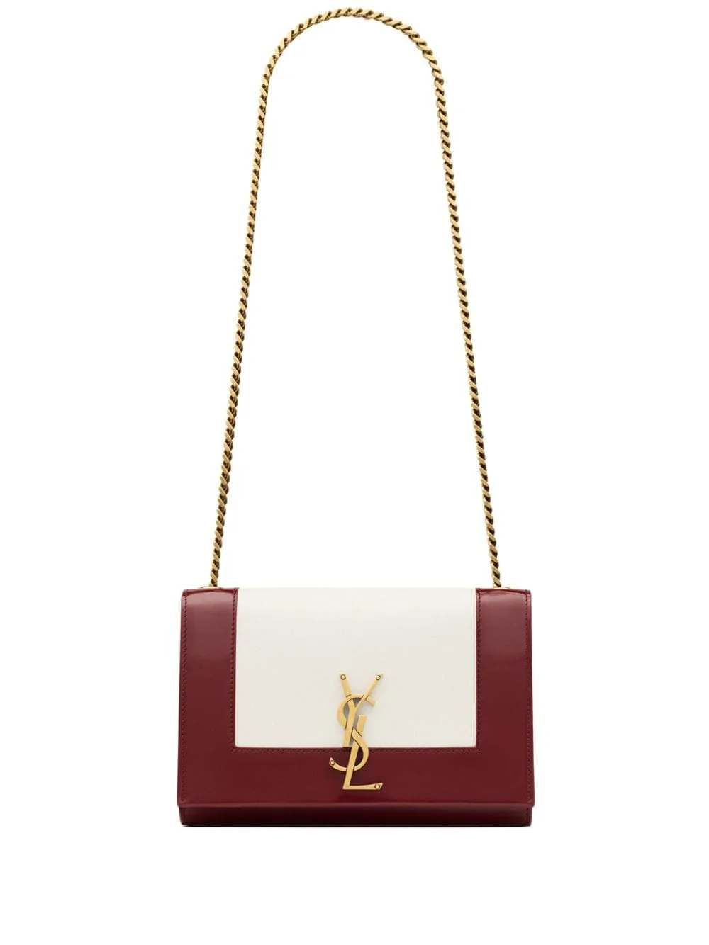 small Kate leather bag Highlights - Bordeaux red/light beige - Lambskin - Signature ysl logo plaque - Chain-link shoulder strap - Foldover top with magnetic fastening - Main compartment - Internal pocket Made in Italy Composition Lambskin 100% SIZE & FIT Measurement WIDTH 7.87 in(20 cm) HEIGHT 5.11 in(13 cm) DEPTH 2.36 in(6 cm) STRAP 13.58 in(34.5 cm)