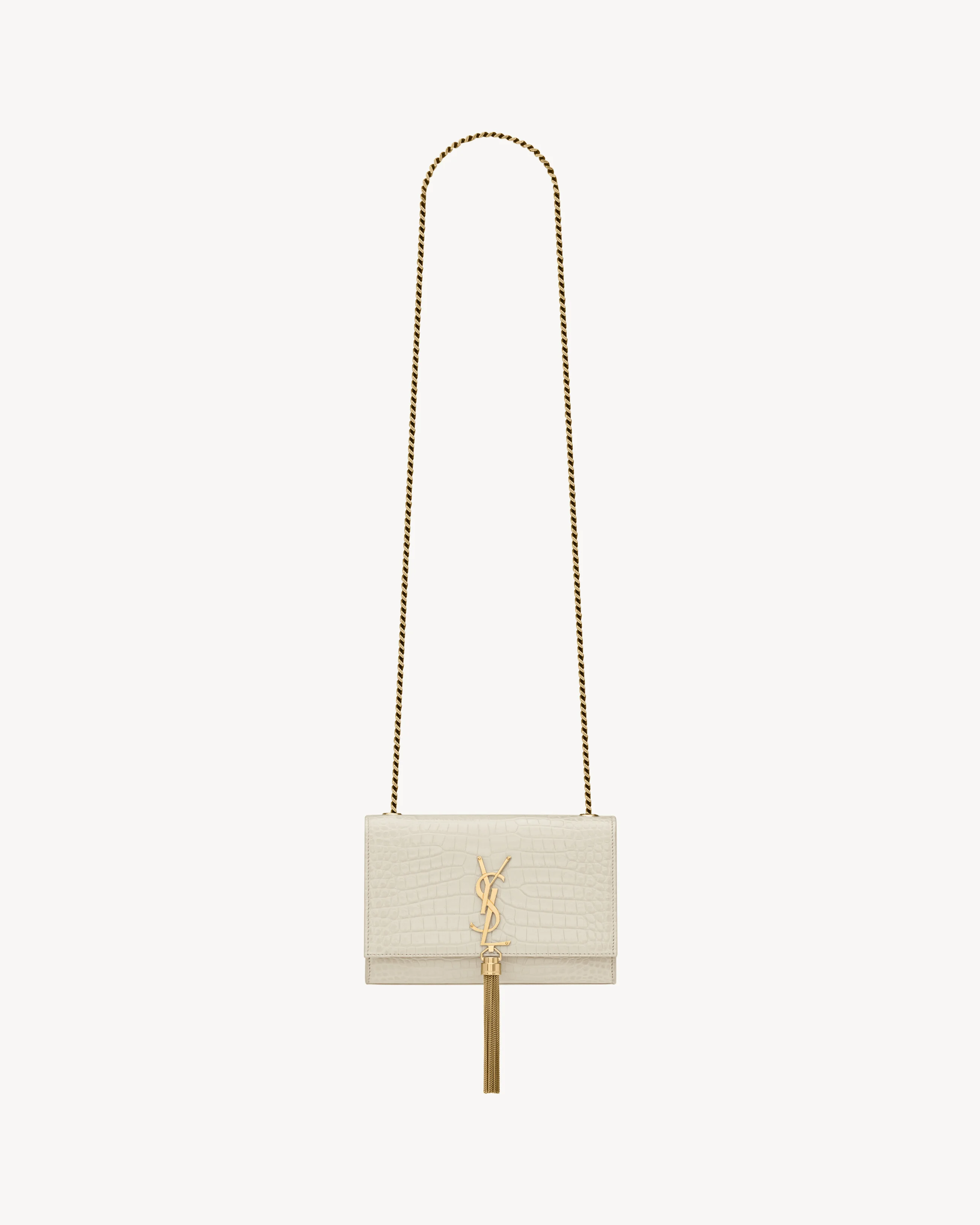 SMALL, ICONIC KATE BAG IN SHINY CROCODILE-EMBOSSED LEATHER FEATURING THE CASSANDRE AND CHAIN TASSEL, WITH A LONG, CURB-LINK CHAIN STRAP THAT CAN BE WORN SEVERAL WAYS. - GROSGRAIN LINING - LIGHT BRONZE BRASS HARDWARE - MAGNETIC SNAP TAB - ONE INTERIOR SLOT POCKET - DIMENSIONS: 8.9 X 4.9 X 2 INCHES - CHAIN LENGTH: 22 INCHES - CALFSKIN LEATHER - STYLE ID 474366DND0J9207 - MADE IN ITALY