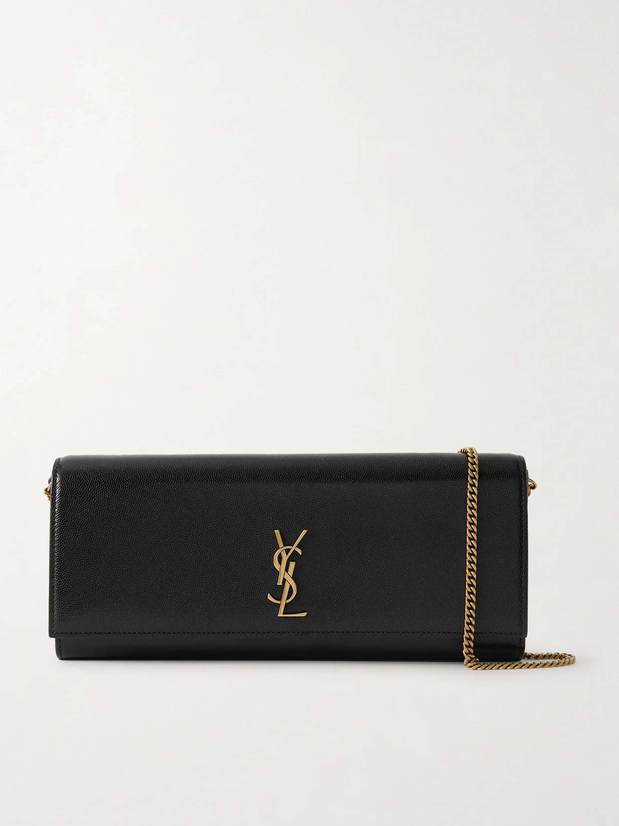 SAINT LAURENT's 'Kate' clutch has been made in Italy from textured-leather in a sleek, elongated shape. It's adorned with the label's iconic 'Cassandre' plaque in gold-tone metal and has enough space inside for your phone, cardholder, and lipstick. Attach the slim shoulder strap to go hands-free.