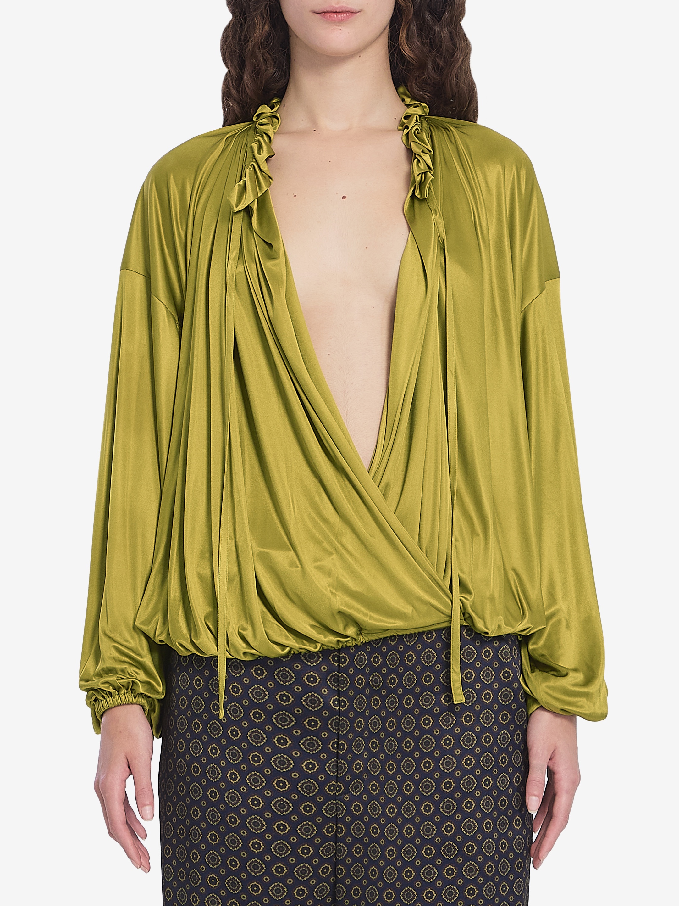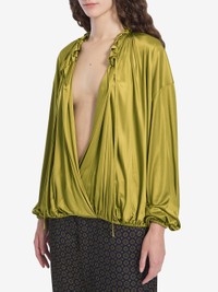 Ruffled blouse in shiny green stretch viscose knit. It features a wrap-style neckline with drawstring and ruffle detailing, dropped shoulders, drawstring hem closure, and long balloon sleeves with elastic cuffs. The model is 181cm tall and wears a size FR 36. More Info Product Number : 1446080 Product Code : 834202Y7F983363 The model is 181cm tall and wears a size FR 36. Composition : 100% viscose Made in: Italy