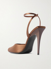 SAINT LAURENT's 'La Scandale' sandals are made from glossy brown satin with slim leather-trimmed straps that twist around the ankle. They rest on 110mm lacquered heels with boxy edges that match the shape of the squared-off peep toes. Size & Fit Fits small to size, take a half size larger than SAINT LAURENT size guide below: - EU 36 = UK 3/ US 6/ IT 36/ FR 37 - EU 36.5 = UK 3.5/ US 6.5/ IT 36.5/ FR 37.5 - EU 37 = UK 4/ US 7/ IT 37/ FR 38 - EU 37.5 = UK 4.5/ US 7.5/ IT 37.5/ FR 38.5 - EU 38 = UK 5/ US 8/ IT 38/ FR 39 - EU 38.5 = UK 5.5/ US 8.5/ IT 38.5/ FR 39.5 - EU 39 = UK 6/ US 9/ IT 39/ FR 40 - EU 39.5 = UK 6.5/ US 9.5/ IT 39.5/ FR 40.5 - EU 40 = UK 7/ US 10/ IT 40/ FR 41 - EU 40.5 = UK 7.5/ US 10.5/ IT 40.5/ FR 41.5 - EU 41 = UK 8/ US 11/ IT 41/ FR 42 - EU 41.5 = UK 8.5/ US 11.5/ IT 41.5/ FR 42.5 - EU 42 = UK 9/ US 12/ IT 42/ FR 43 Details & Care - Heel measures approximately 110mm/ 4.5 inches - Brown satin and leather (Lamb) - Buckle-fastening ankle strap