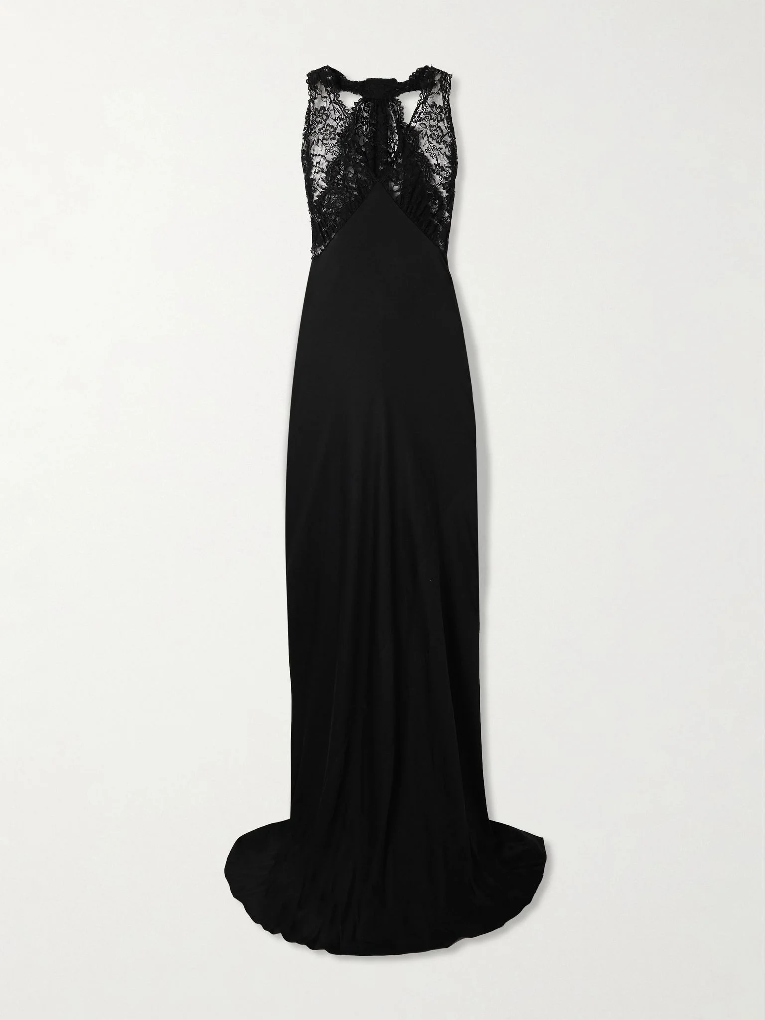 Lace-trimmed silk-charmeuse halterneck gown Black