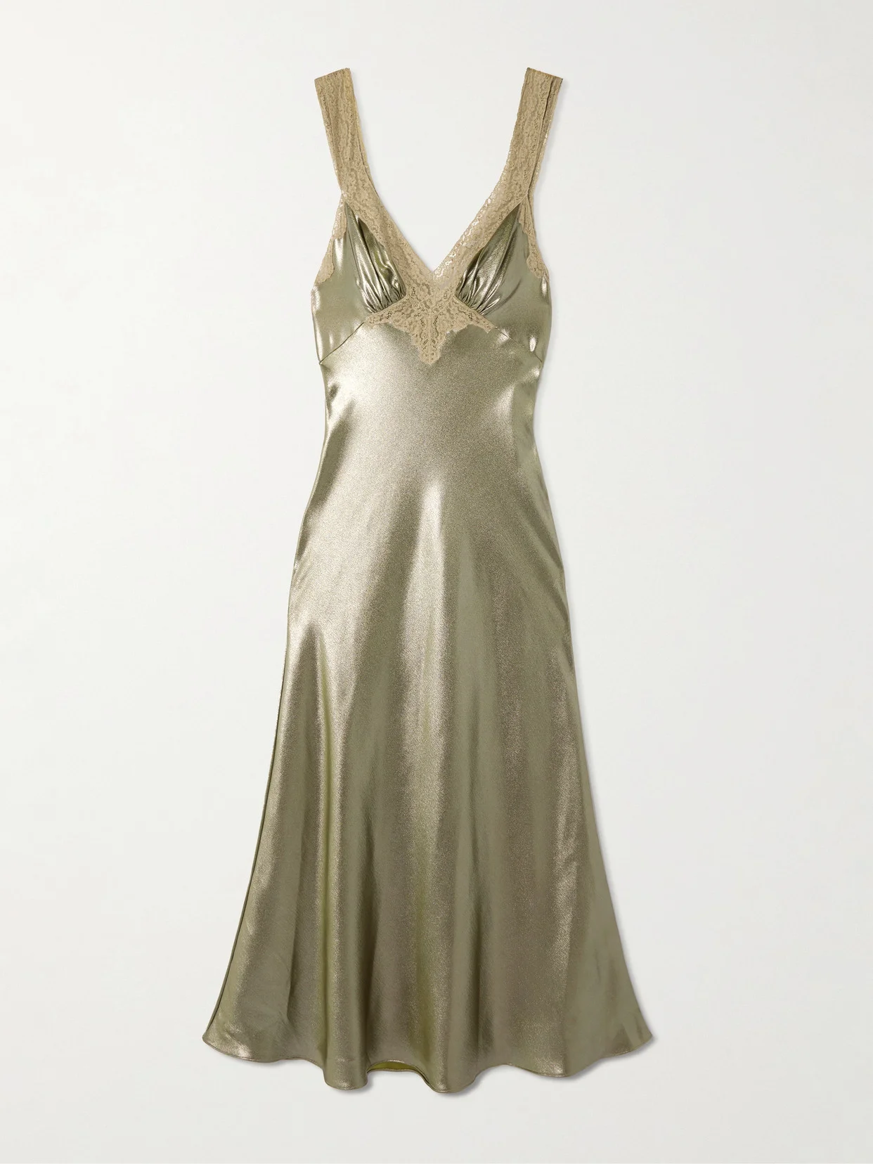 Like so many of the pieces in SAINT LAURENT's Fall '25 collection, this dress is inspired by glamorous lingerie. It's made from pewter silk-charmeuse that has a liquid-like sheen and is traced with cotton-blend lace along the straps and gathered bust. Keep accessories and makeup on the simple side.