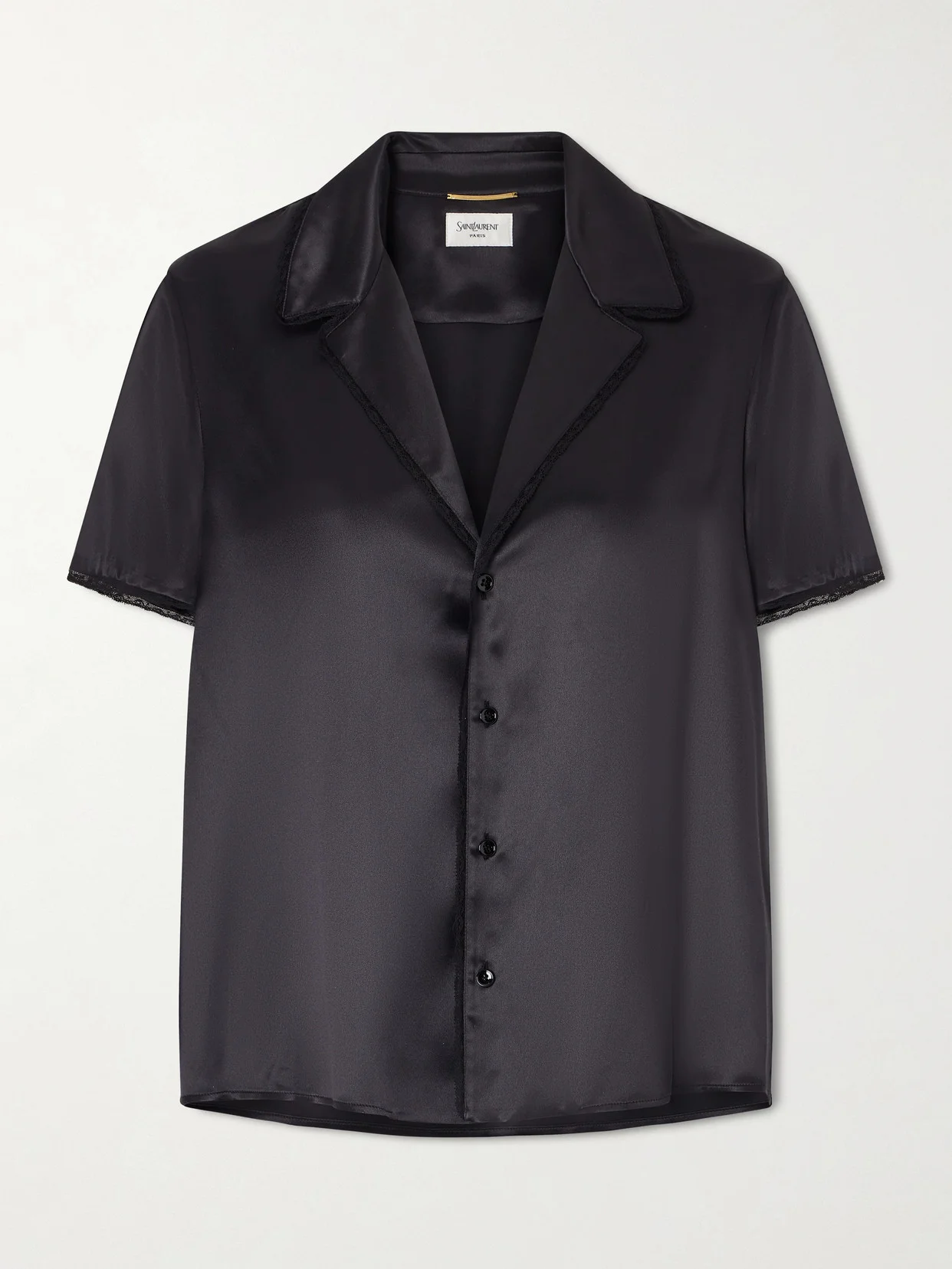 SAINT LAURENT's shirt has been tailored in Italy from black silk-satin, prized for its lustrous handle and natural drape. Framed by a camp collar, it's inspired by pajama styles and outlined with a lace border.