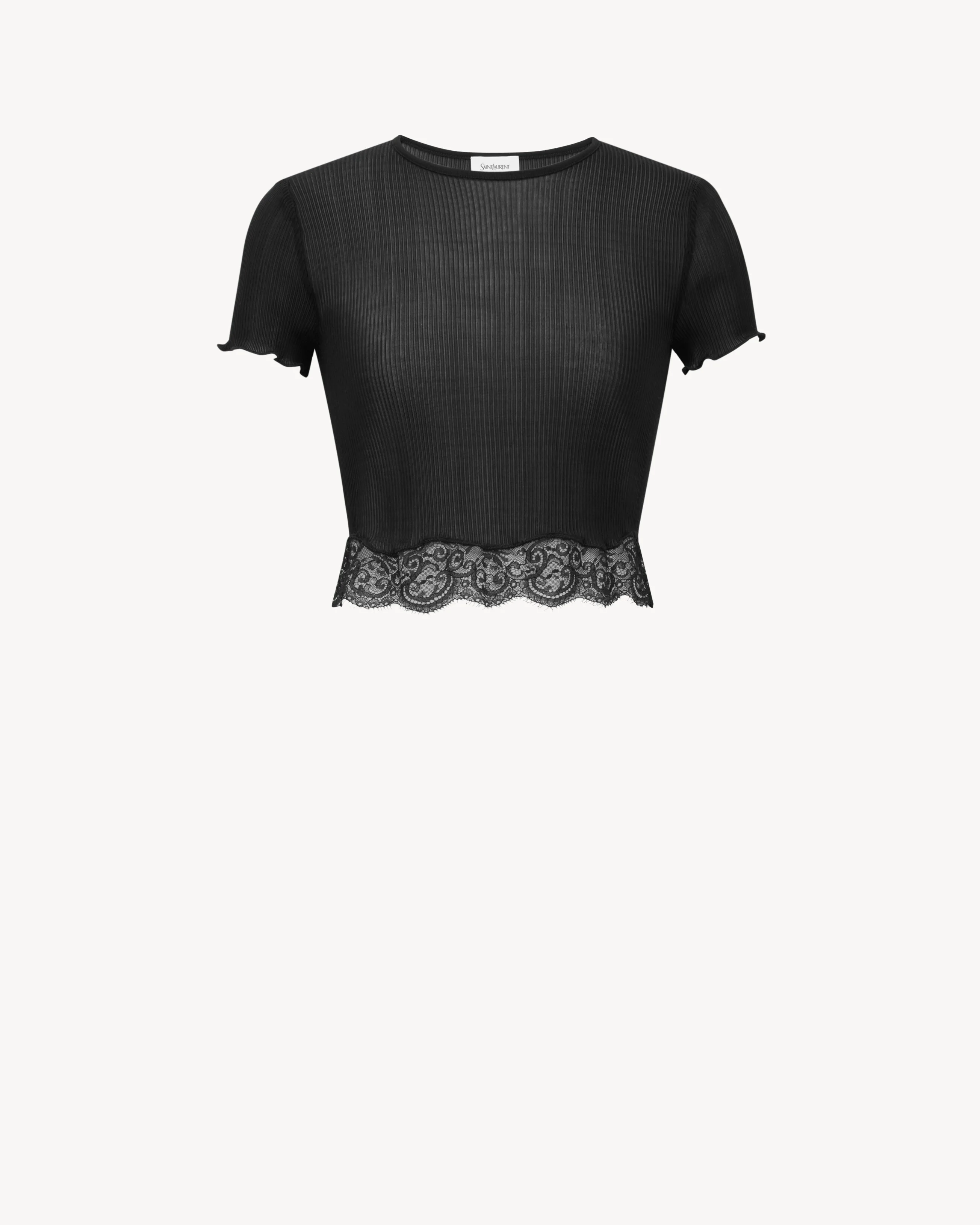 SEMI-SHEER FITTED T-SHIRT MADE WITH CERTIFIED SILK, FEATURING FRILLED CUFFS AND A SCALLOPED LACE HEM. - CERTIFIED SILK - CREWNECK - 100% SILK - STYLE ID 841965Y37SM1000 - MADE IN ITALY